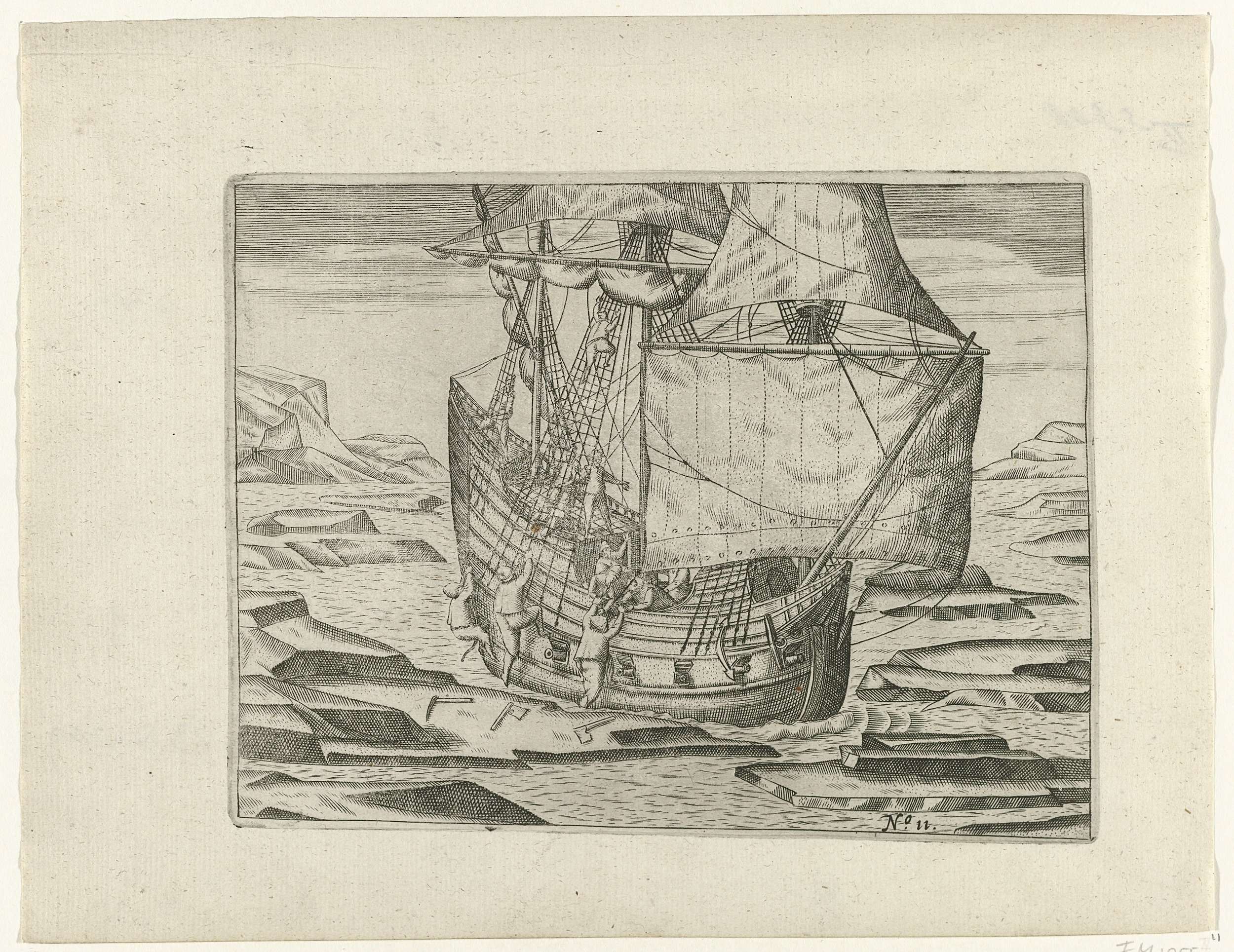 Het schip raakt vast in het ijs, 26 augustus 1596. Leden van de bemanning klauteren overboord om het ijs rond het schip los te hakken. Kopieën naar de oorspronkelijke illustraties in het reisverslag van de tocht van Willem Barendsz en Jacob van Heemskerck in 1596-1597 en het verblijf op het eiland Nova Zembla, No. 11.