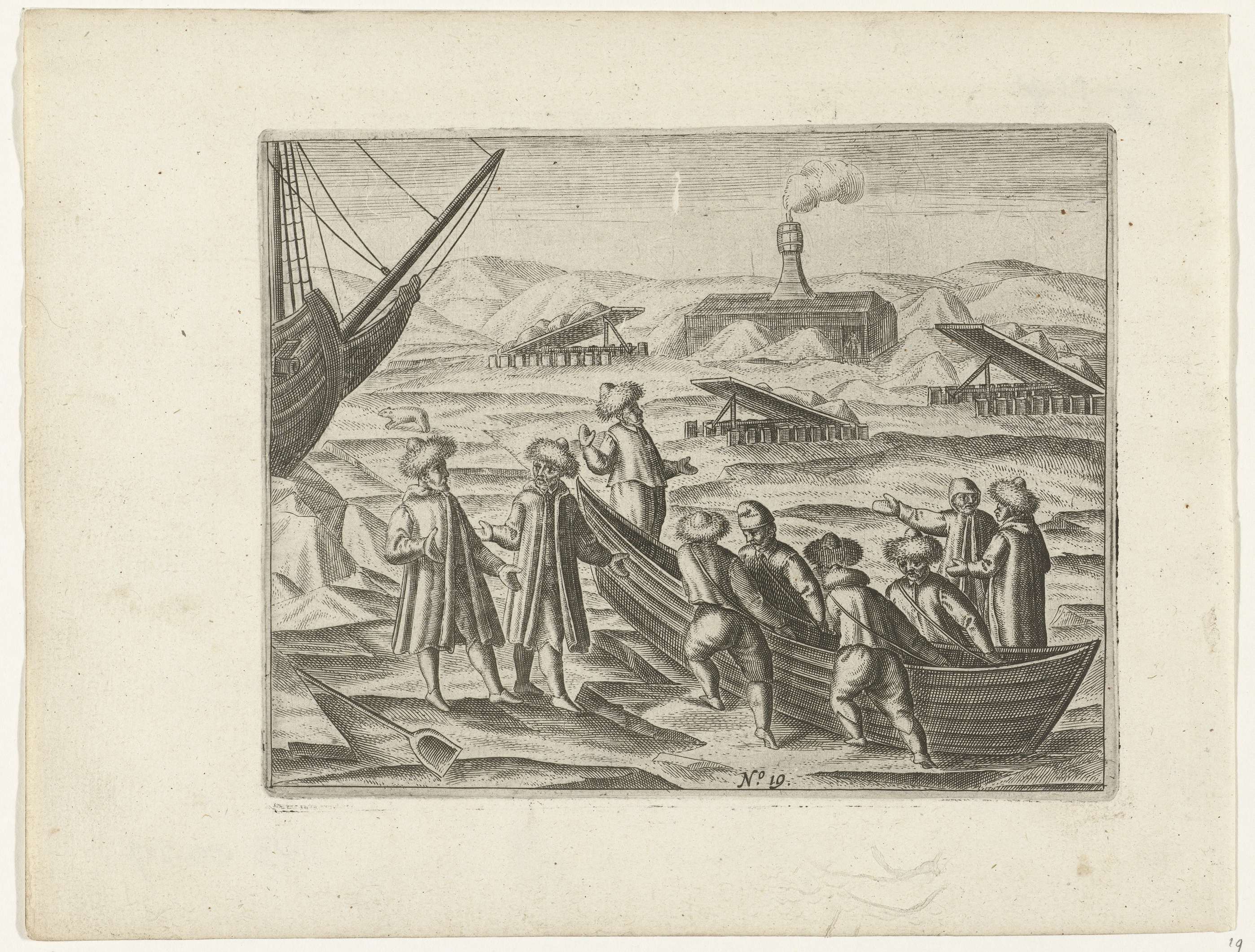 Mislukte poging om de schuit naar het Behouden Huys te slepen om deze daar zeeklaar te maken, 29 mei 1597. Kopieën naar de oorspronkelijke illustraties in het reisverslag van de tocht van Willem Barendsz en Jacob van Heemskerck in 1596-1597 en het verblijf op het eiland Nova Zembla, No. 19.