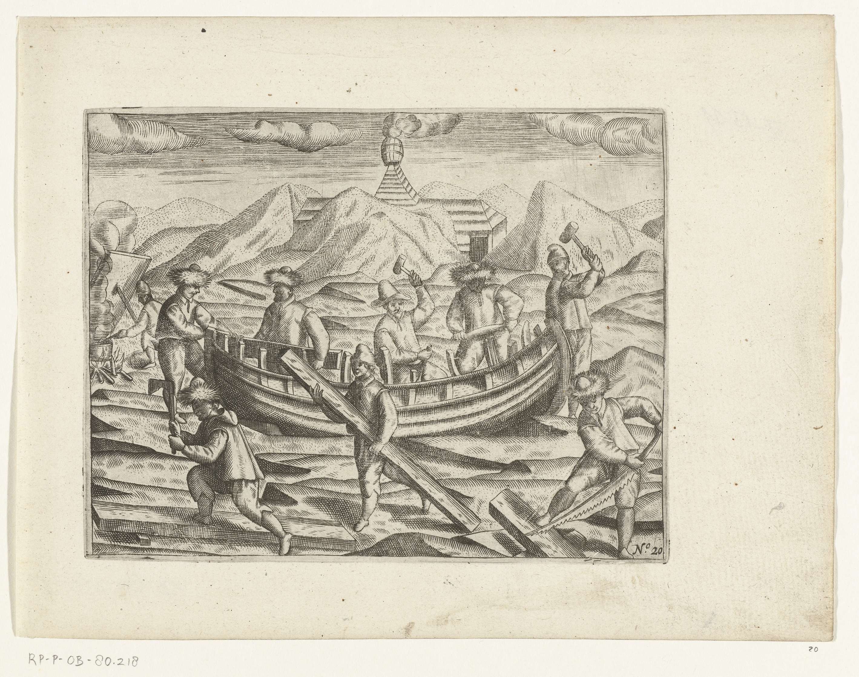 Timmerwerk aan de sloep om deze zeewaardig te maken voor de terugreis, 29 mei 1597. Kopieën naar de oorspronkelijke illustraties in het reisverslag van de tocht van Willem Barendsz en Jacob van Heemskerck in 1596-1597 en het verblijf op het eiland Nova Zembla, No. 20.