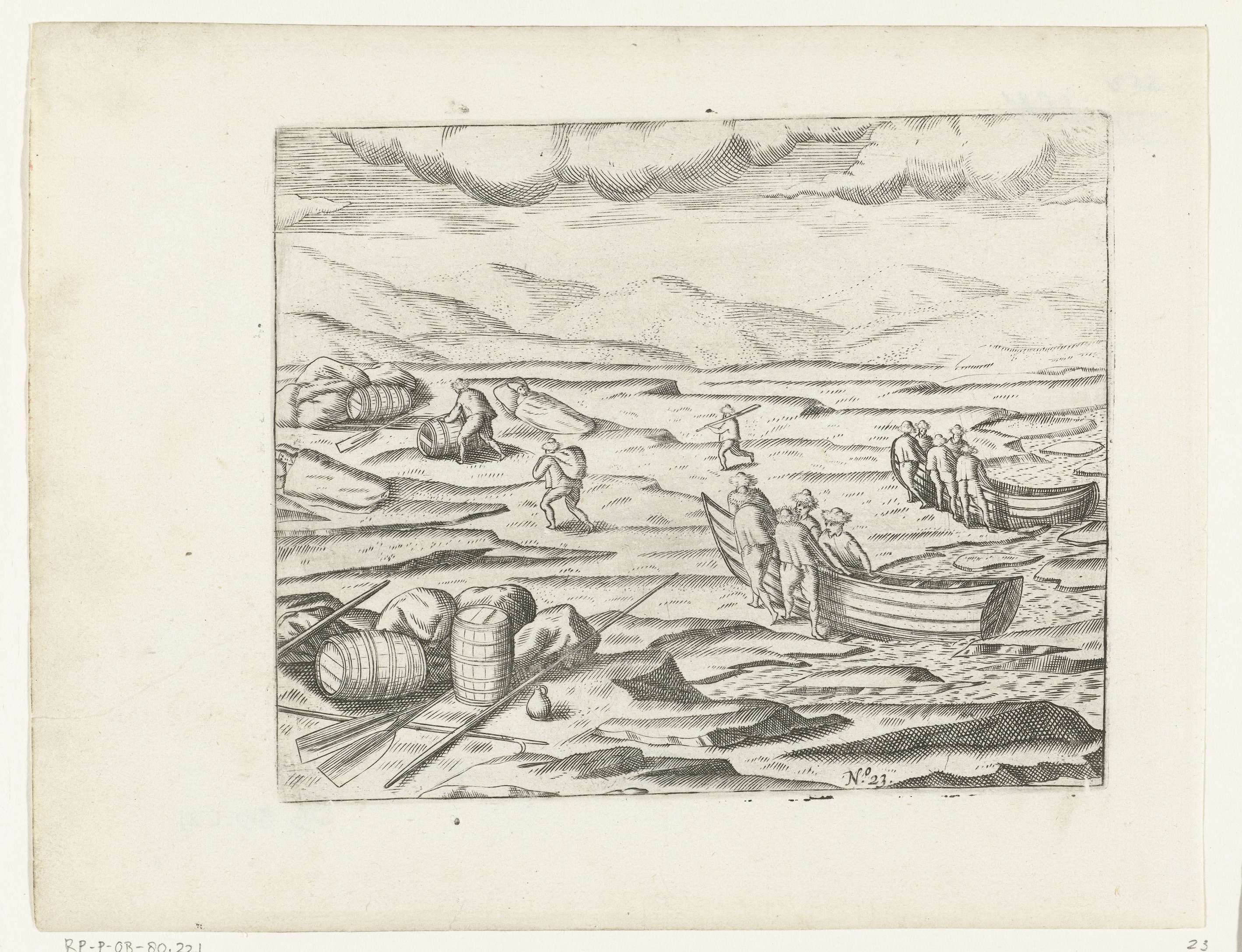 De sloepen worden uit het water gehaald, 17 juni 1597. De twee zieken, Willem Barendsz en Claes Andriesz Goutijk, liggen onder dekens op het ijs. Op de voorgrond proviand, tonnen en roeispanen. Kopieën naar de oorspronkelijke illustraties in het reisverslag van de tocht van Willem Barendsz en Jacob van Heemskerck in 1596-1597 en het verblijf ...
