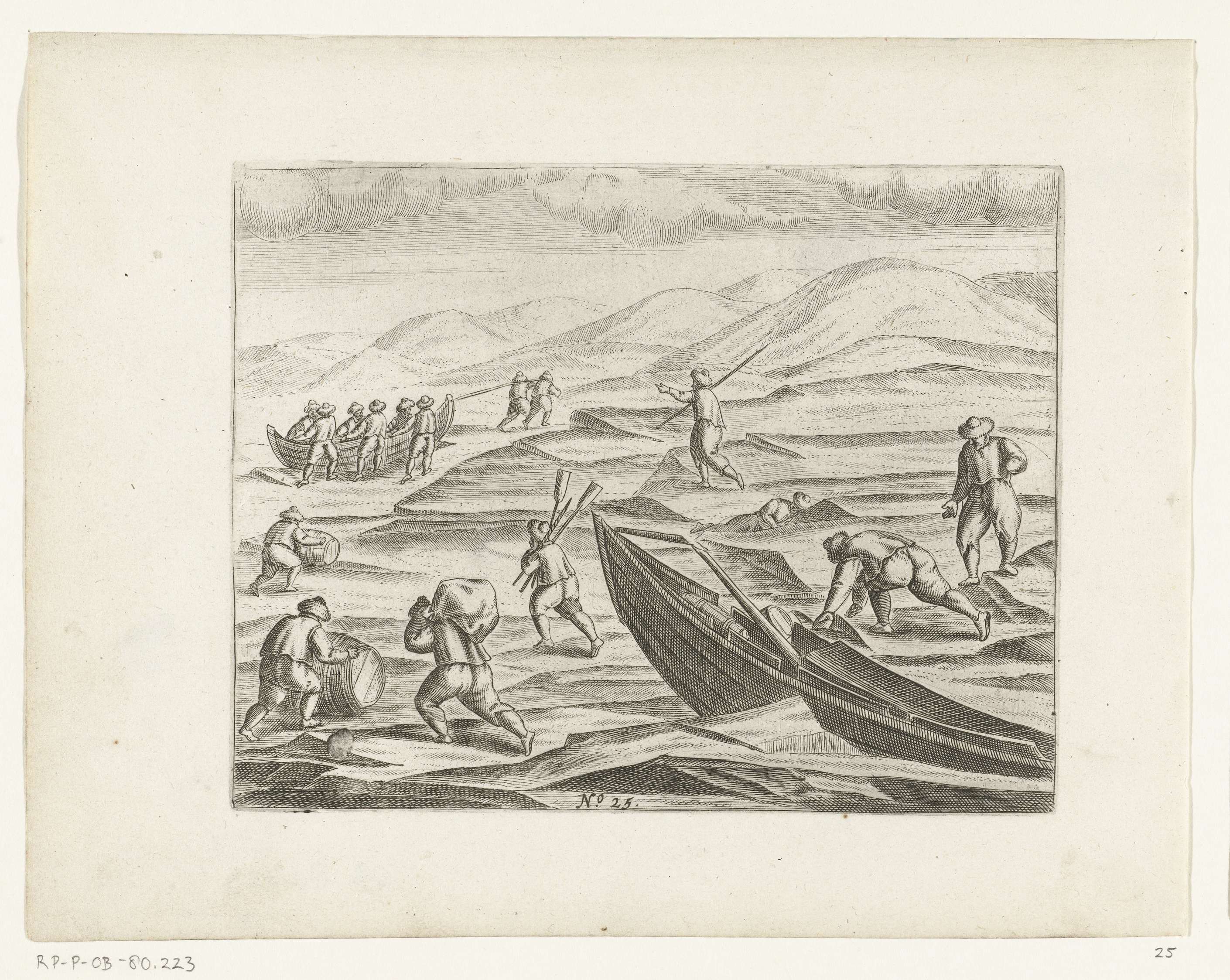 De door het schuivende ijs verpletterde sloep wordt weer uitgeladen, 1 juli 1597. Kopieën naar de oorspronkelijke illustraties in het reisverslag van de tocht van Willem Barendsz en Jacob van Heemskerck in 1596-1597 en het verblijf op het eiland Nova Zembla, No. 25.
