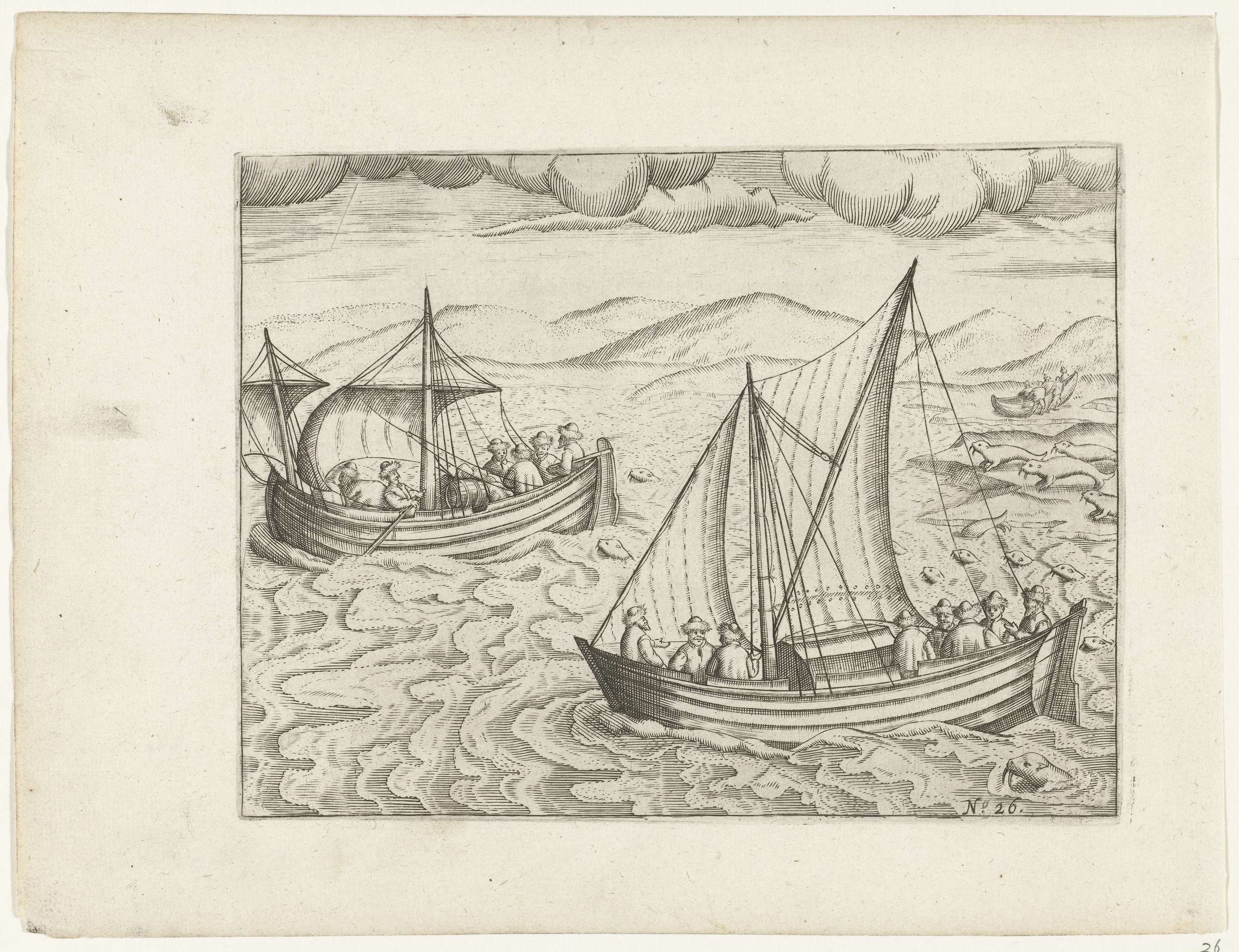 Het vertrek van het eiland Nova Zembla met de schuit en de boot, 1597, 19 juli 1597. Kopieën naar de oorspronkelijke illustraties in het reisverslag van de tocht van Willem Barendsz en Jacob van Heemskerck in 1596-1597 en het verblijf op het eiland Nova Zembla, No. 26.