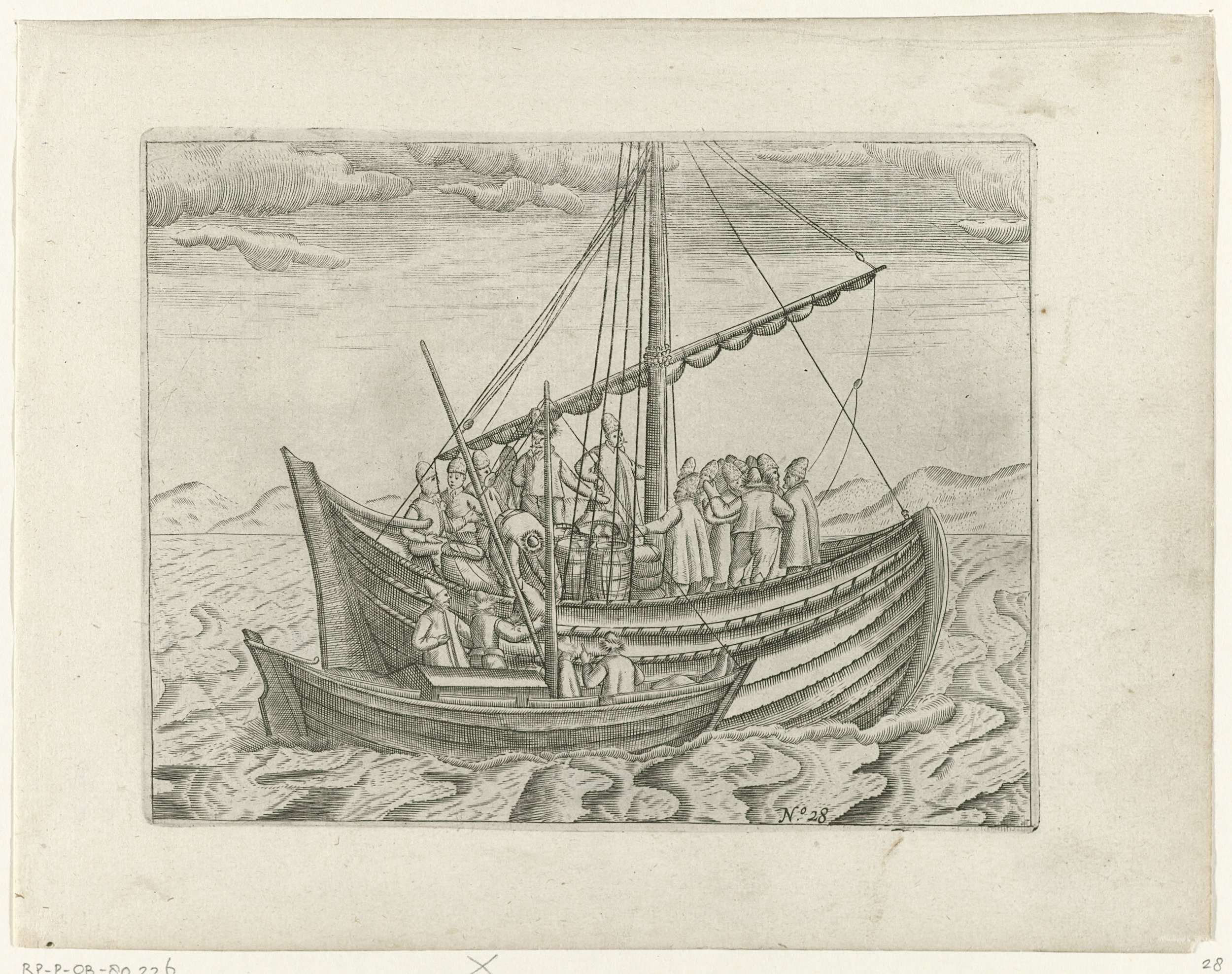 De ontmoeting met een Russische lodja, 12 augustus 1597. De schuit ligt langszij het Russische schip waar de Nederlanders etenswaren kopen en informatie over hun koers krijgen. Kopieën naar de oorspronkelijke illustraties in het reisverslag van de tocht van Willem Barendsz en Jacob van Heemskerck in 1596-1597 en het verblijf op het eiland Nova Zembla, ...