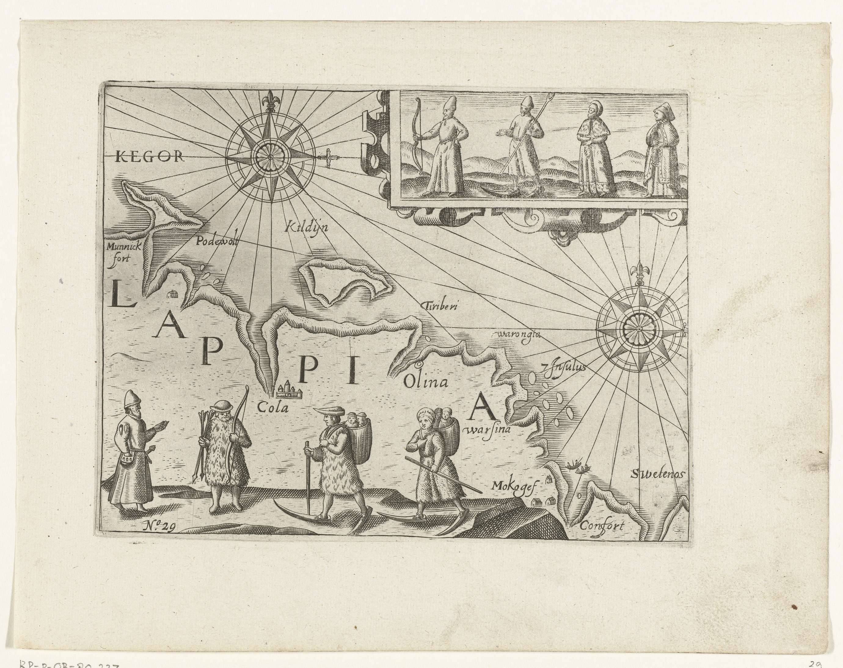 Kaart van de Russische kust met het plaatsje Kola bij Moermansk, waar de boten op 25 augustus 1597 aankwamen. Onder en boven vier voorbeelden van het kostuum van de plaatselijke bewoners. Kopieën naar de oorspronkelijke illustraties in het reisverslag van de tocht van Willem Barendsz en Jacob van Heemskerck in 1596-1597 en het verblijf op ...