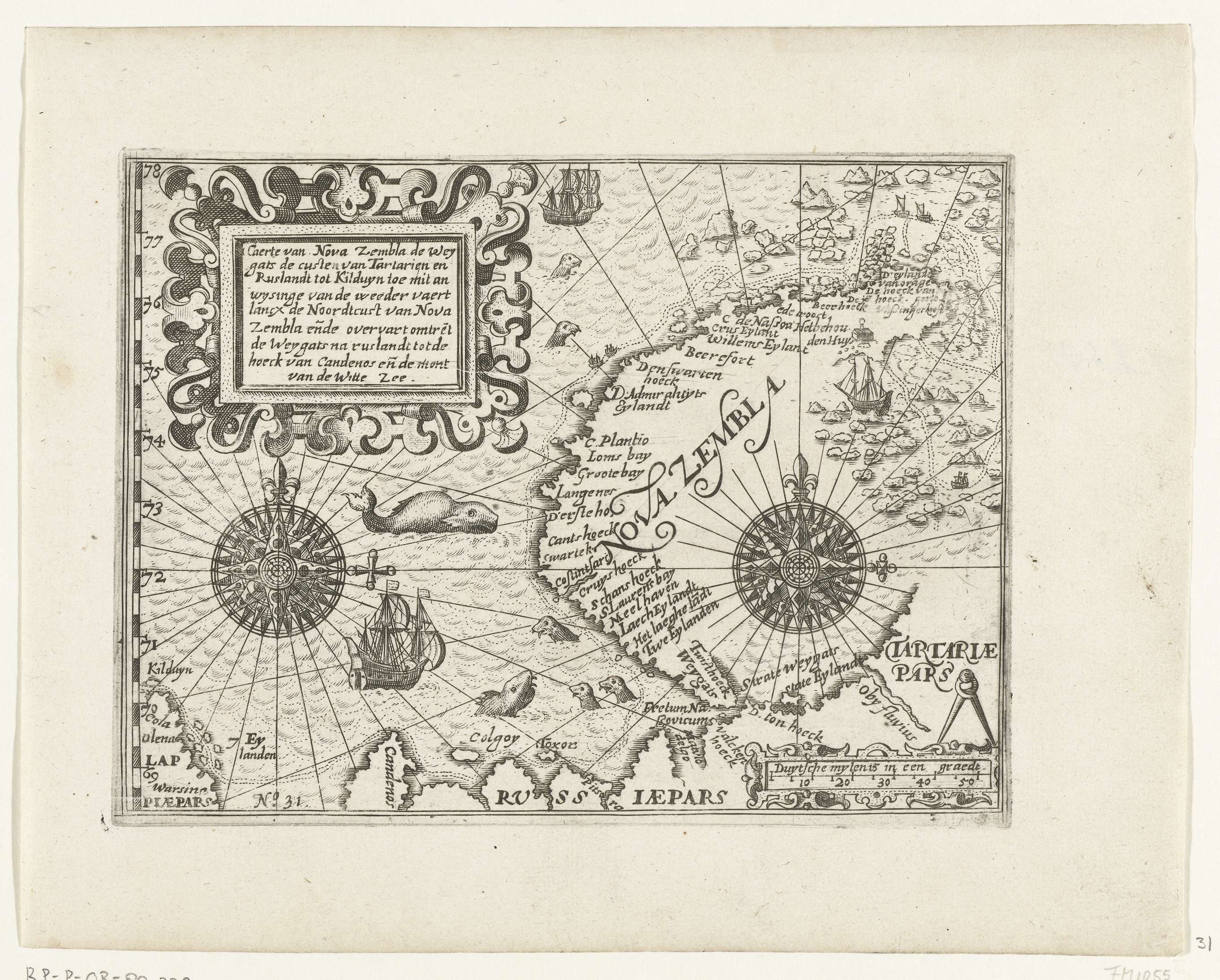 Kaartje van Nova Zembla en de Russische noordkust. Linksboven een versierde cartouche met de titel, links en rechts twee windrozen, rechtsonder de schalen. Kopieën naar de oorspronkelijke illustraties in het reisverslag van de tocht van Willem Barendsz en Jacob van Heemskerck in 1596-1597 en het verblijf op het eiland Nova Zembla, No. 31.