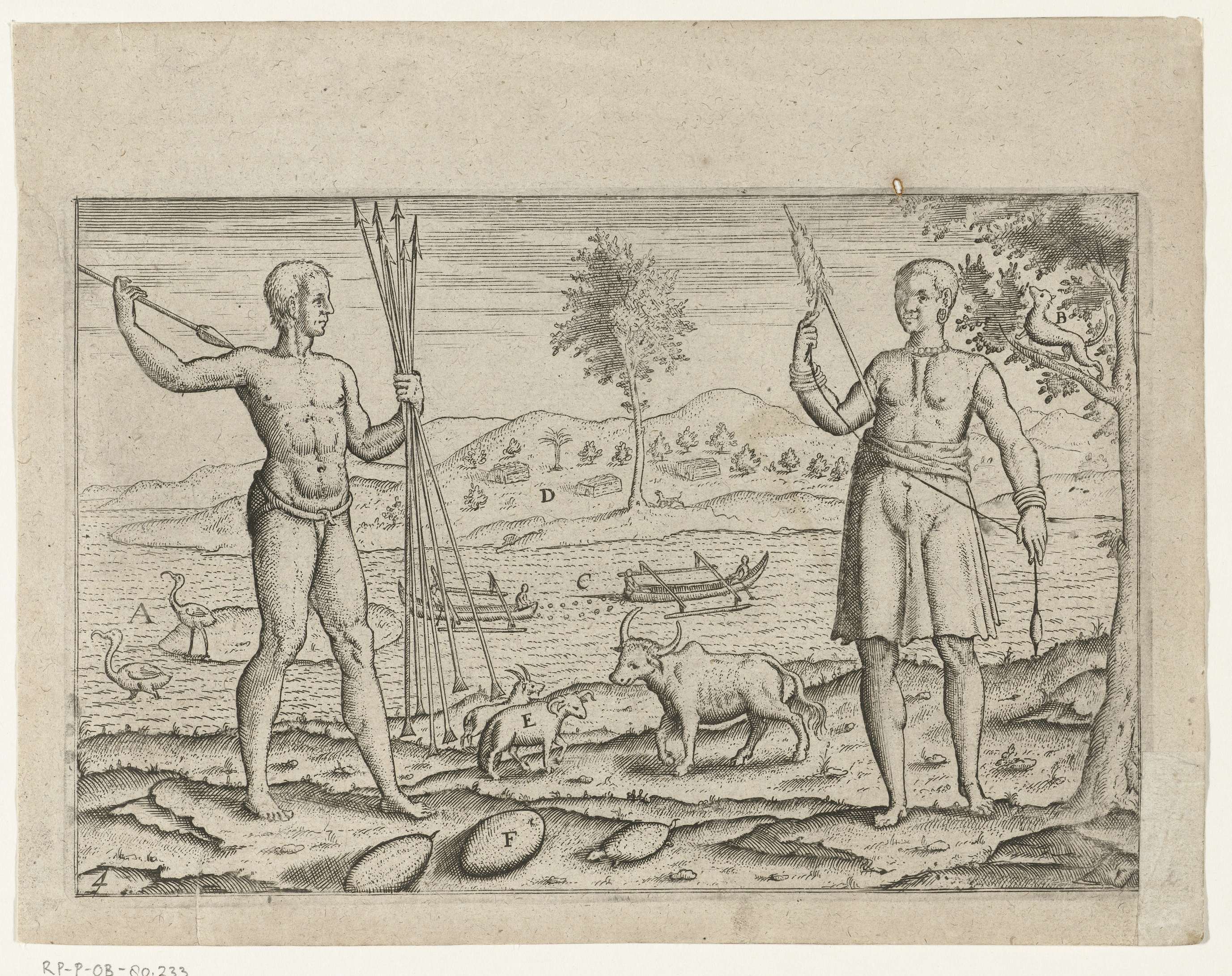 Twee inwoners van Madagaskar. Links een man met speer, rechts een spinnende vrouw, beiden staande in landschap tussen dieren. Afdrukken van de opgewerkte platen voor de oorspronkelijke illustraties in het reisverslag van de Eerste Schipvaert van Cornelis de Houtman naar Oost-Indië in 1595-1597. No. 4.