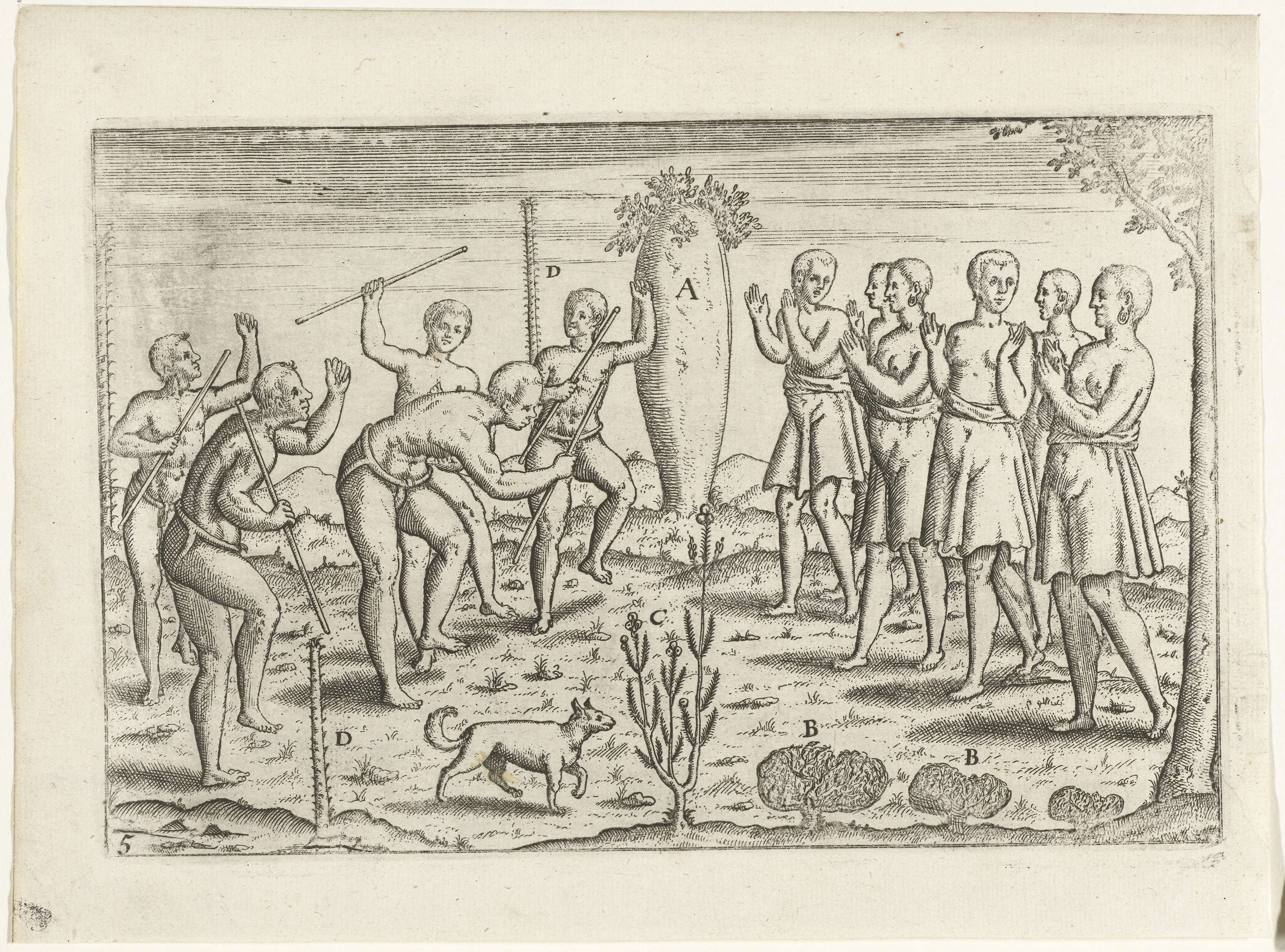 Dans van de inwoners van Madagaskar. Links vijf dansende mannen, rechts zes vrouwen die zingen en met hun handen klappen. Afdrukken van de opgewerkte platen voor de oorspronkelijke illustraties in het reisverslag van de Eerste Schipvaert van Cornelis de Houtman naar Oost-Indië in 1595-1597. No. 5.