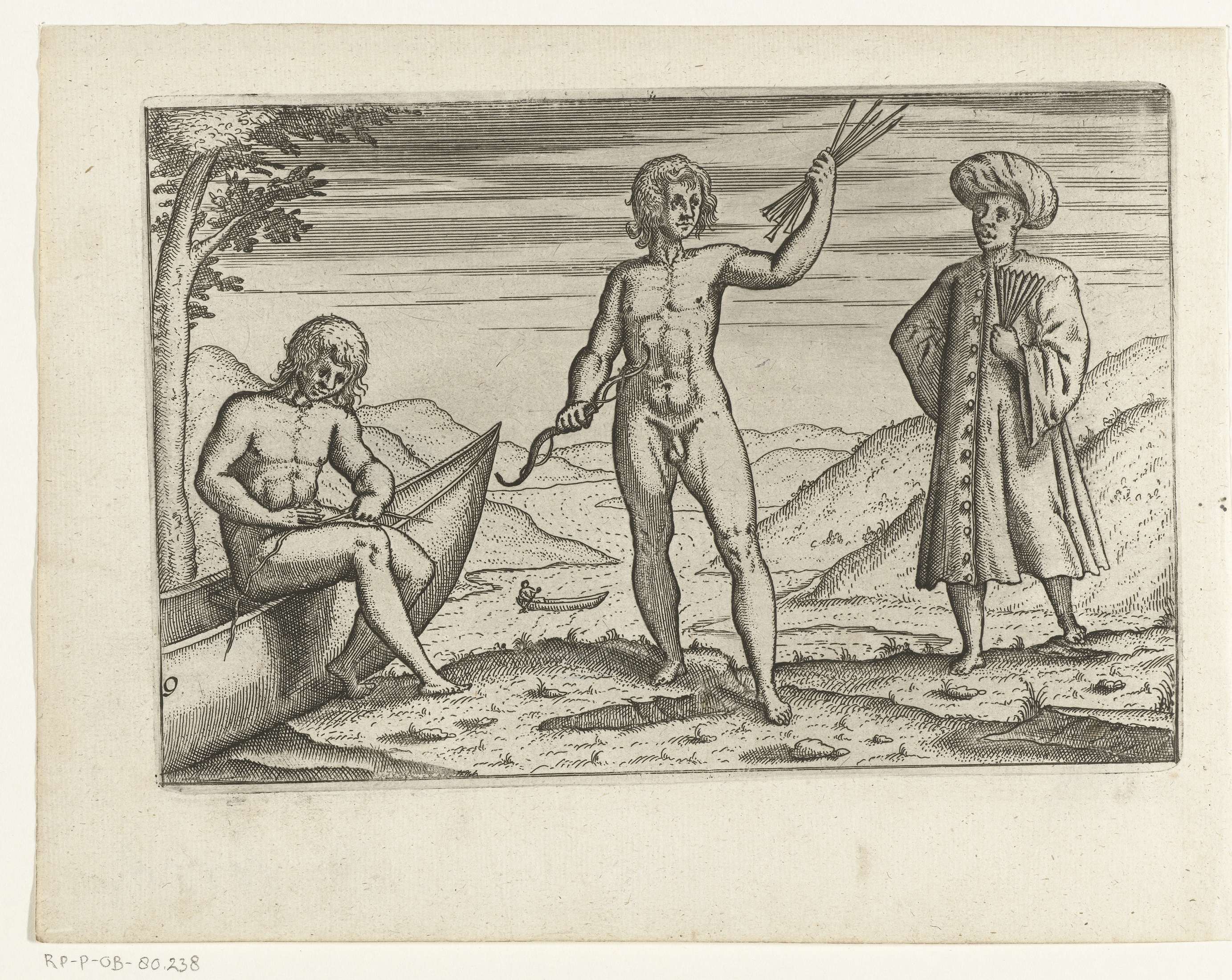 Drie inwoners van het eiland Pugniatan (Enggano), een eiland bij de Straat van Sunda tussen Sumatra en Java, 1596. Afdrukken van de opgewerkte platen voor de oorspronkelijke illustraties in het reisverslag van de Eerste Schipvaert van Cornelis de Houtman naar Oost-Indië in 1595-1597. No. 9.