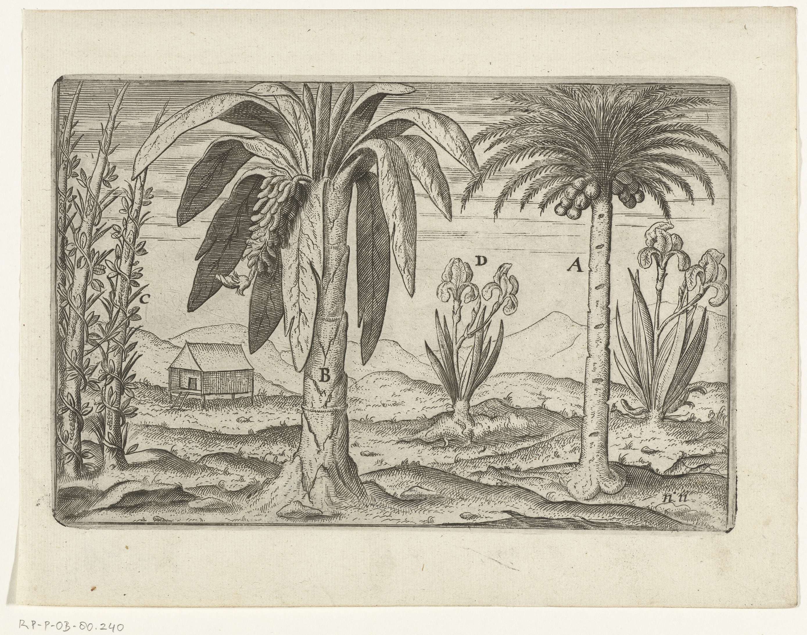 Inheemse gewassen van Sumatra, 1596. Kokospalm, bananenboom, peperplant en irissen. Afdrukken van de opgewerkte platen voor de oorspronkelijke illustraties in het reisverslag van de Eerste Schipvaert van Cornelis de Houtman naar Oost-Indië in 1595-1597. No. 11.