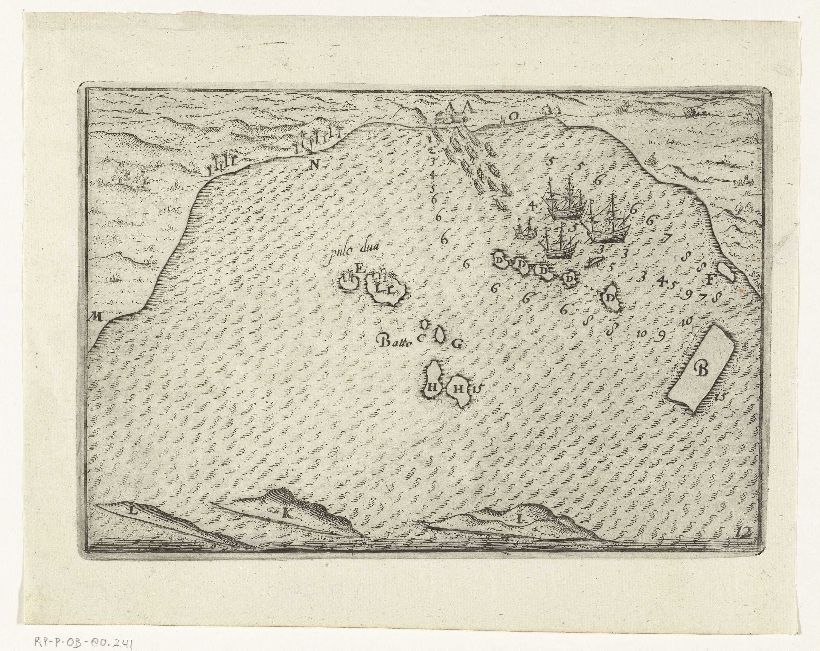 Kaartje van de baai van Bantam (Banten) op Java met de vier schepen, 1596. Afdrukken van de opgewerkte platen voor de oorspronkelijke illustraties in het reisverslag van de Eerste Schipvaert van Cornelis de Houtman naar Oost-Indië in 1595-1597. No. 12.