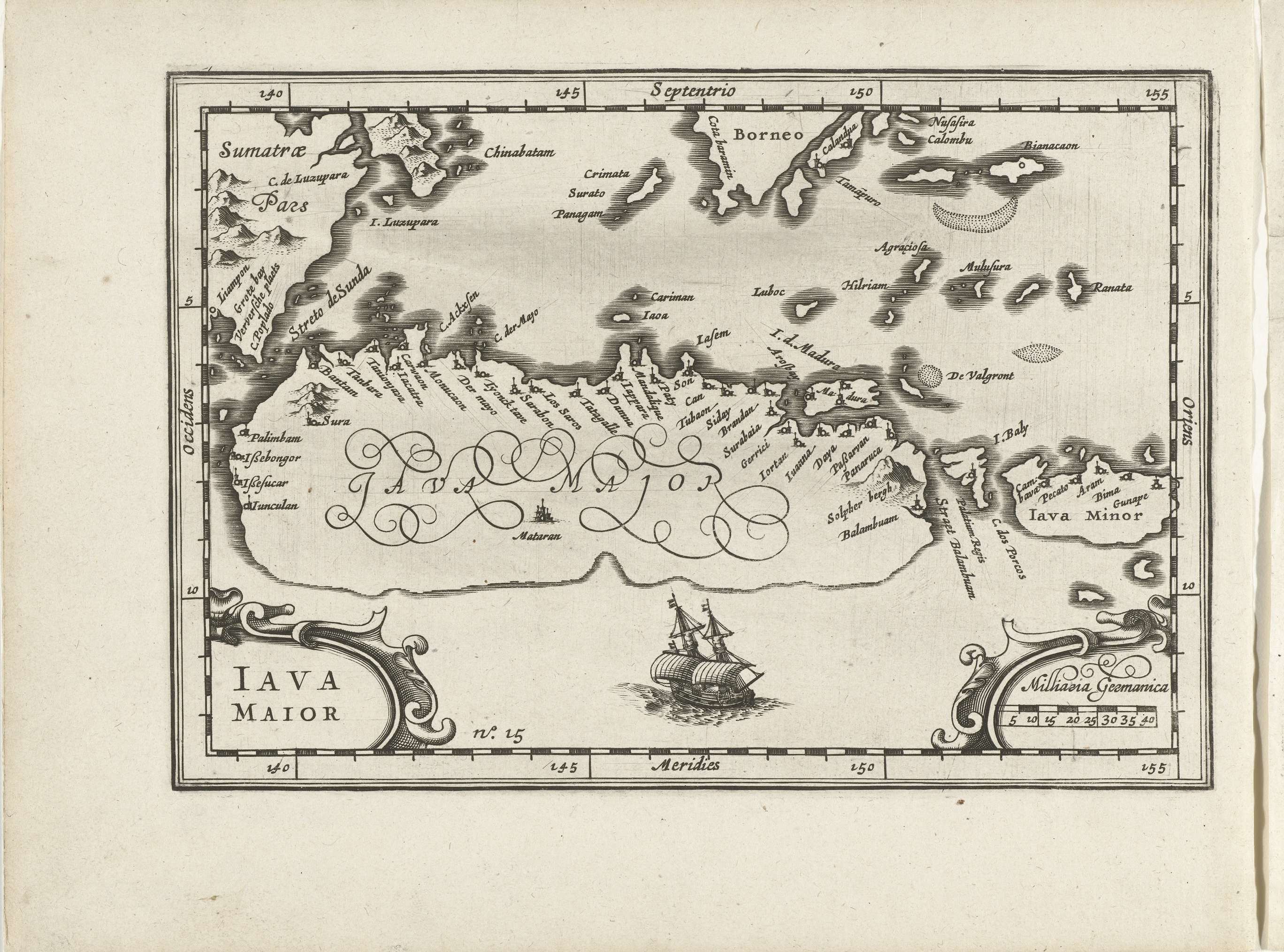 Kaart van het eiland Java, 1596. Linksonder een cartouche met de titel, rechtsonder de schaal. Behoort niet tot de oorspronkelijke illustraties in het reisverslag van de Eerste Schipvaert van Cornelis de Houtman naar Oost-Indië in 1595-1597. No. 15.