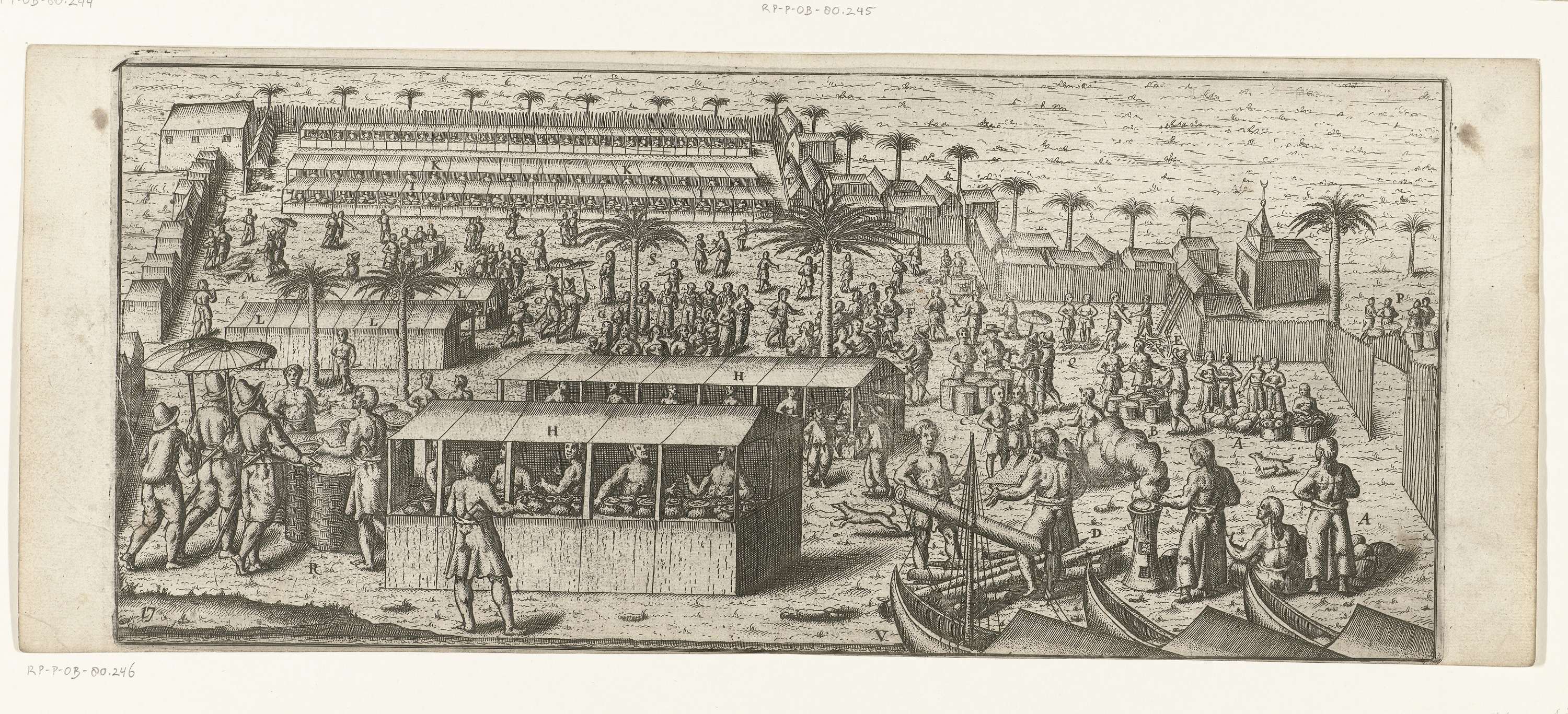 Bazaar van Bantam (Banten), links een groepje Hollanders, 1596. Afdrukken van de opgewerkte platen voor de oorspronkelijke illustraties in het reisverslag van de Eerste Schipvaert van Cornelis de Houtman naar Oost-Indië in 1595-1597. No. 17.