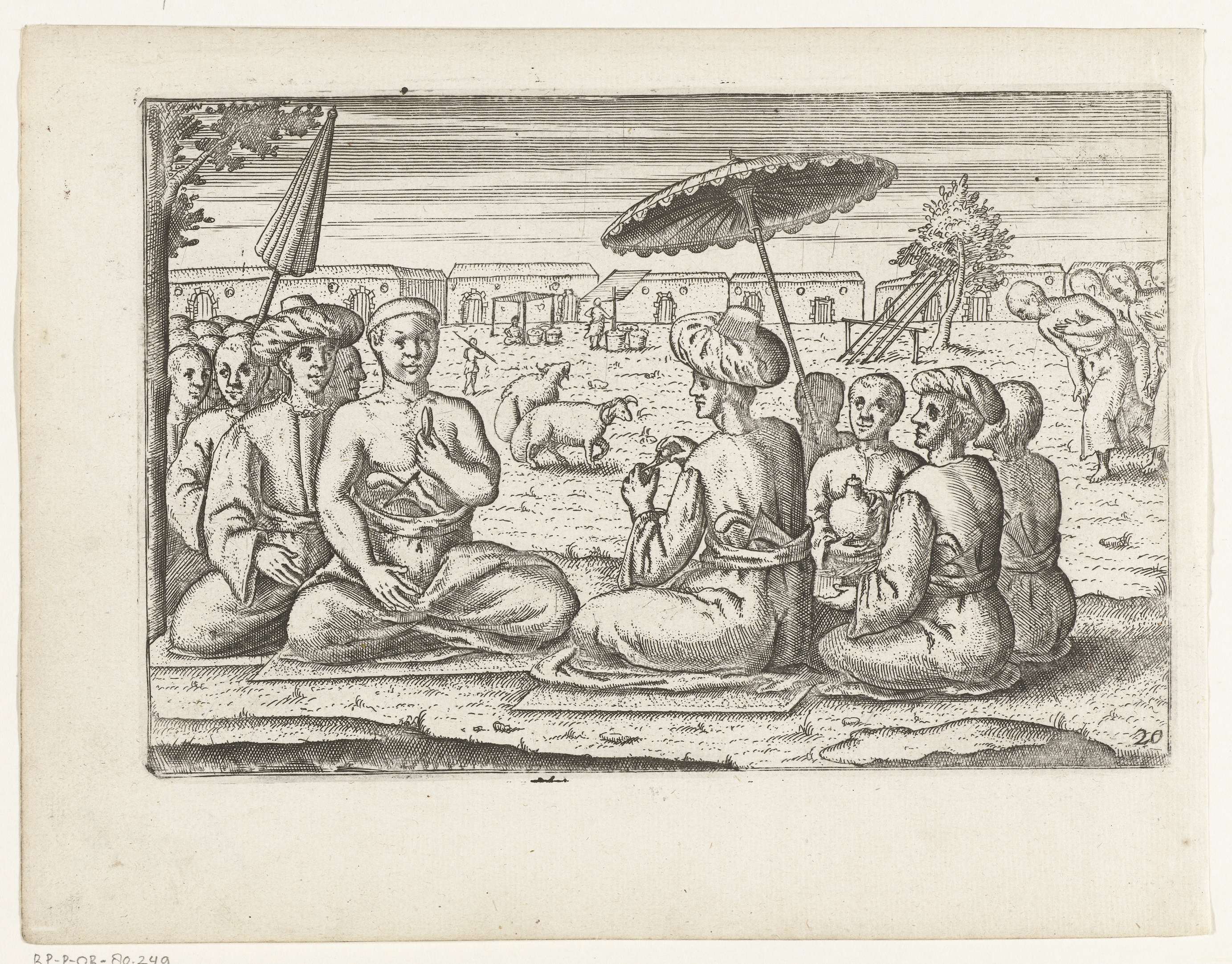 De gouverneur (Ki Patih) en de opper-Sjaich (Kali) van Bantam, 1596. Groep Javaanse hoogwaardigheidsbekleders gezetn op de grond onder een parasol. Afdrukken van de opgewerkte platen voor de oorspronkelijke illustraties in het reisverslag van de Eerste Schipvaert van Cornelis de Houtman naar Oost-Indië in 1595-1597. No. 20.