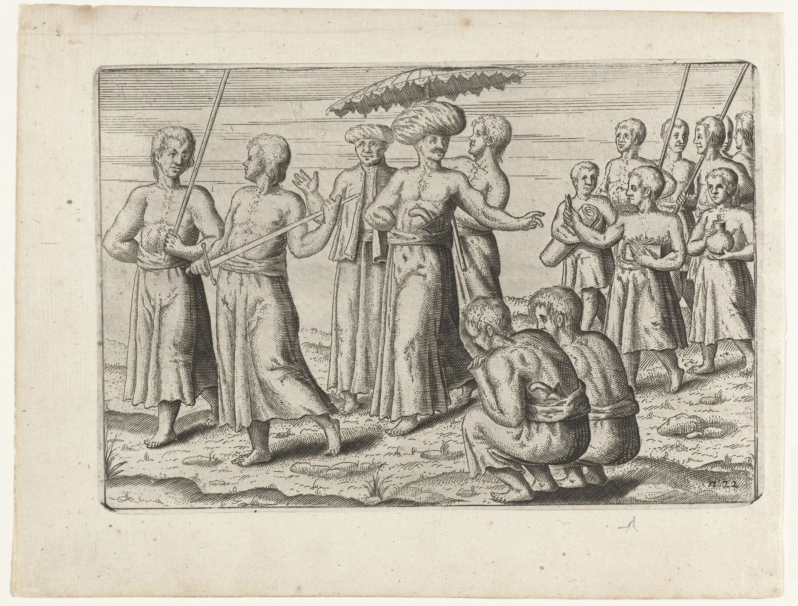 Javaanse kapitein (Poenggawa) begeleid door een drager met parasol, een gewapende escorte en gevolg, te Bantam (Banten), 1596. Afdrukken van de opgewerkte platen voor de oorspronkelijke illustraties in het reisverslag van de Eerste Schipvaert van Cornelis de Houtman naar Oost-Indië in 1595-1597. No. 22.