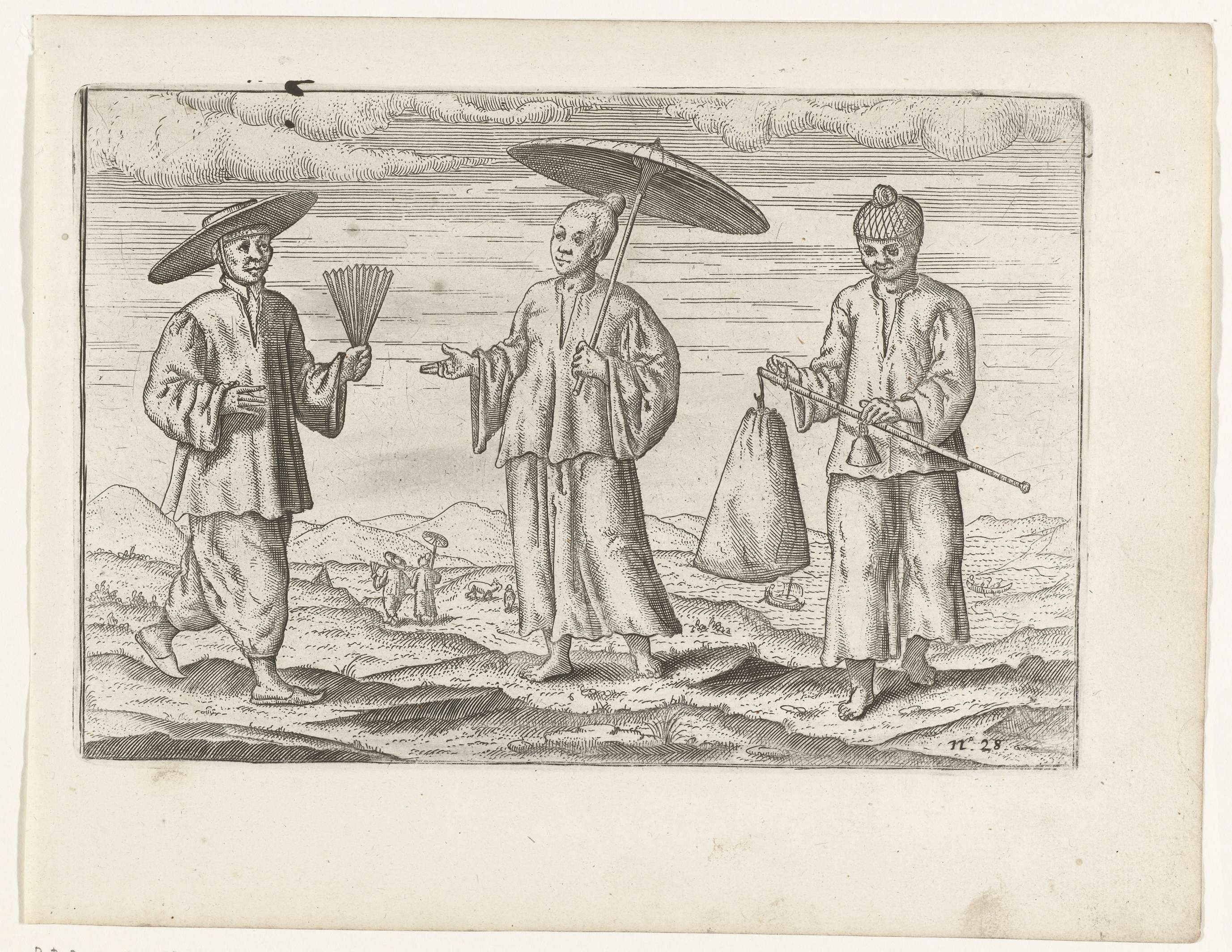Drie Chinese kooplieden te Bantam, (Banten), 1596. Afdrukken van de opgewerkte platen voor de oorspronkelijke illustraties in het reisverslag van de Eerste Schipvaert van Cornelis de Houtman naar Oost-Indië in 1595-1597. No. 28.