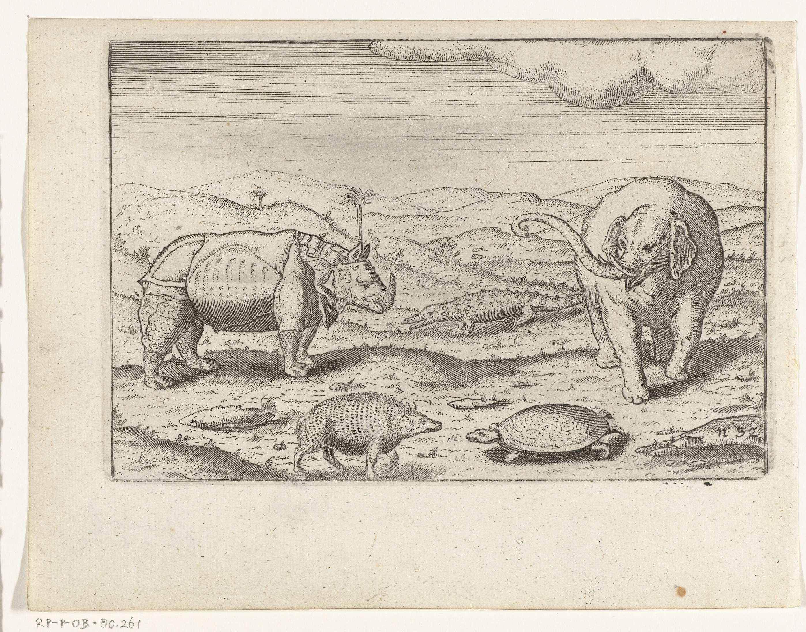 Dieren van Java, 1596. Olifant, neushoorn, krokodil, schildpad en stekelvarken. Afdrukken van de opgewerkte platen voor de oorspronkelijke illustraties in het reisverslag van de Eerste Schipvaert van Cornelis de Houtman naar Oost-Indië in 1595-1597. No. 32.