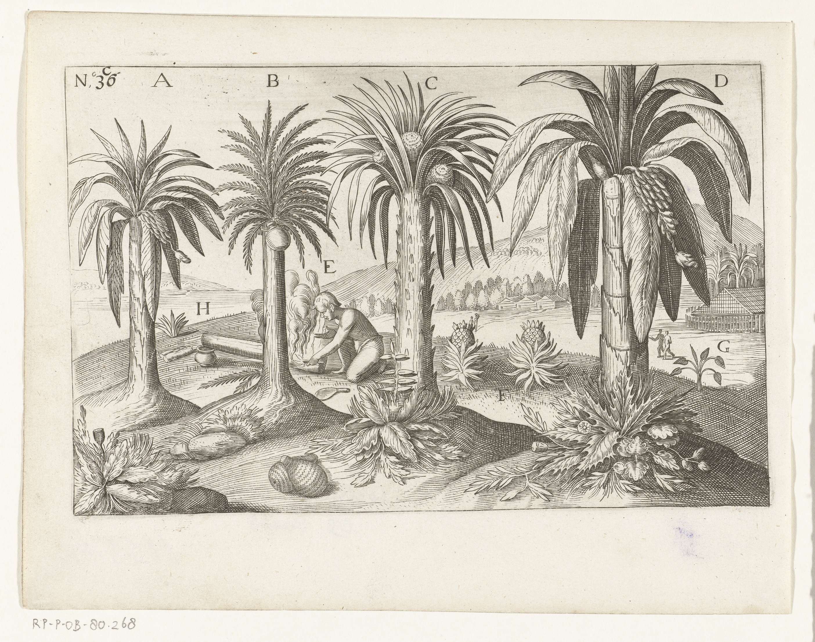 Fruitbomen en kruiden op Java, 1596. Vier soorten palmen en ananas. Behoort niet tot de oorspronkelijke illustraties in het reisverslag van de Eerste Schipvaert van Cornelis de Houtman naar Oost-Indië in 1595-1597 (?). No. 36C.