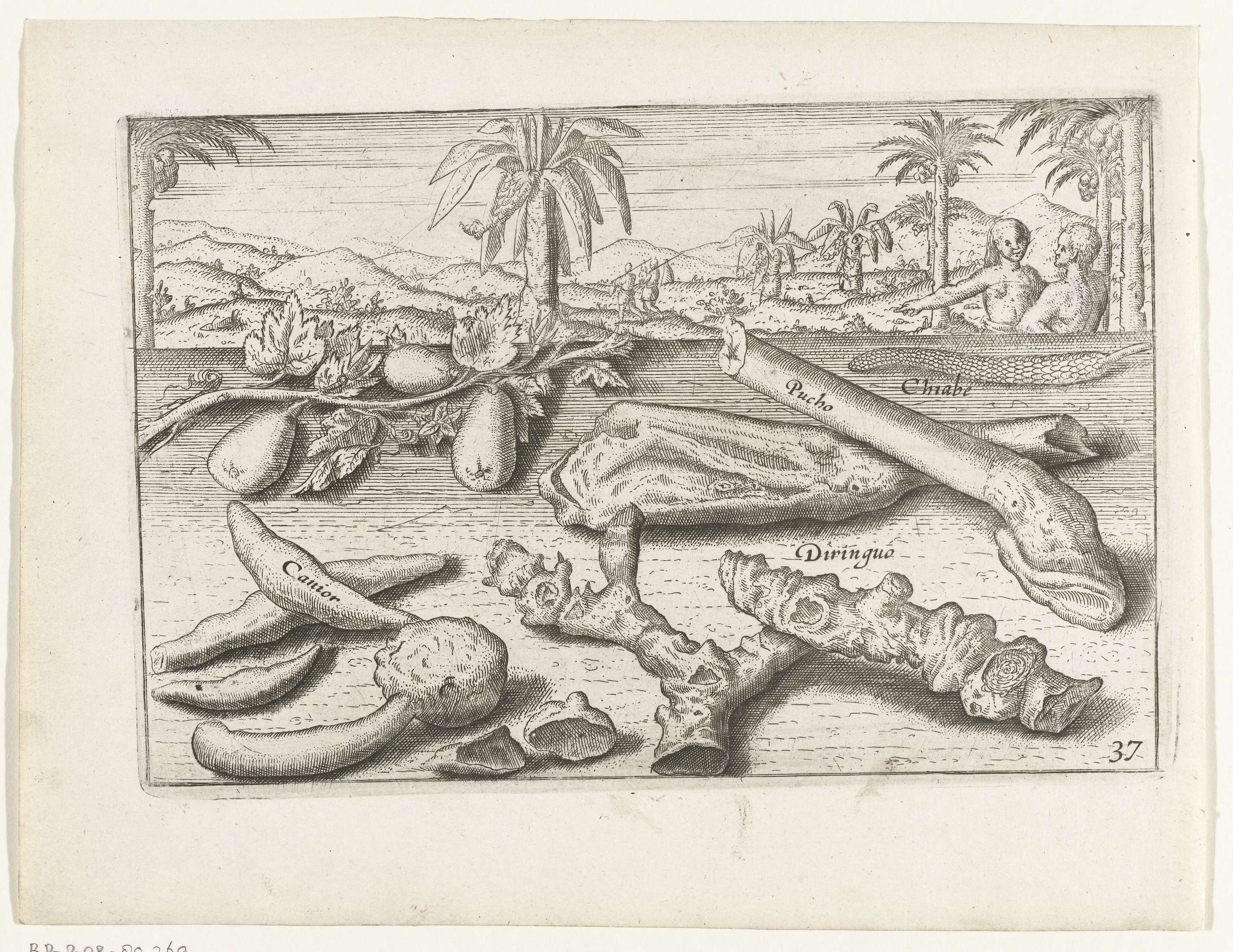 Kruiden en knolgewassen op Java, 1596. Afdrukken van de opgewerkte platen voor de oorspronkelijke illustraties in het reisverslag van de Eerste Schipvaert van Cornelis de Houtman naar Oost-Indië in 1595-1597. No. 37.