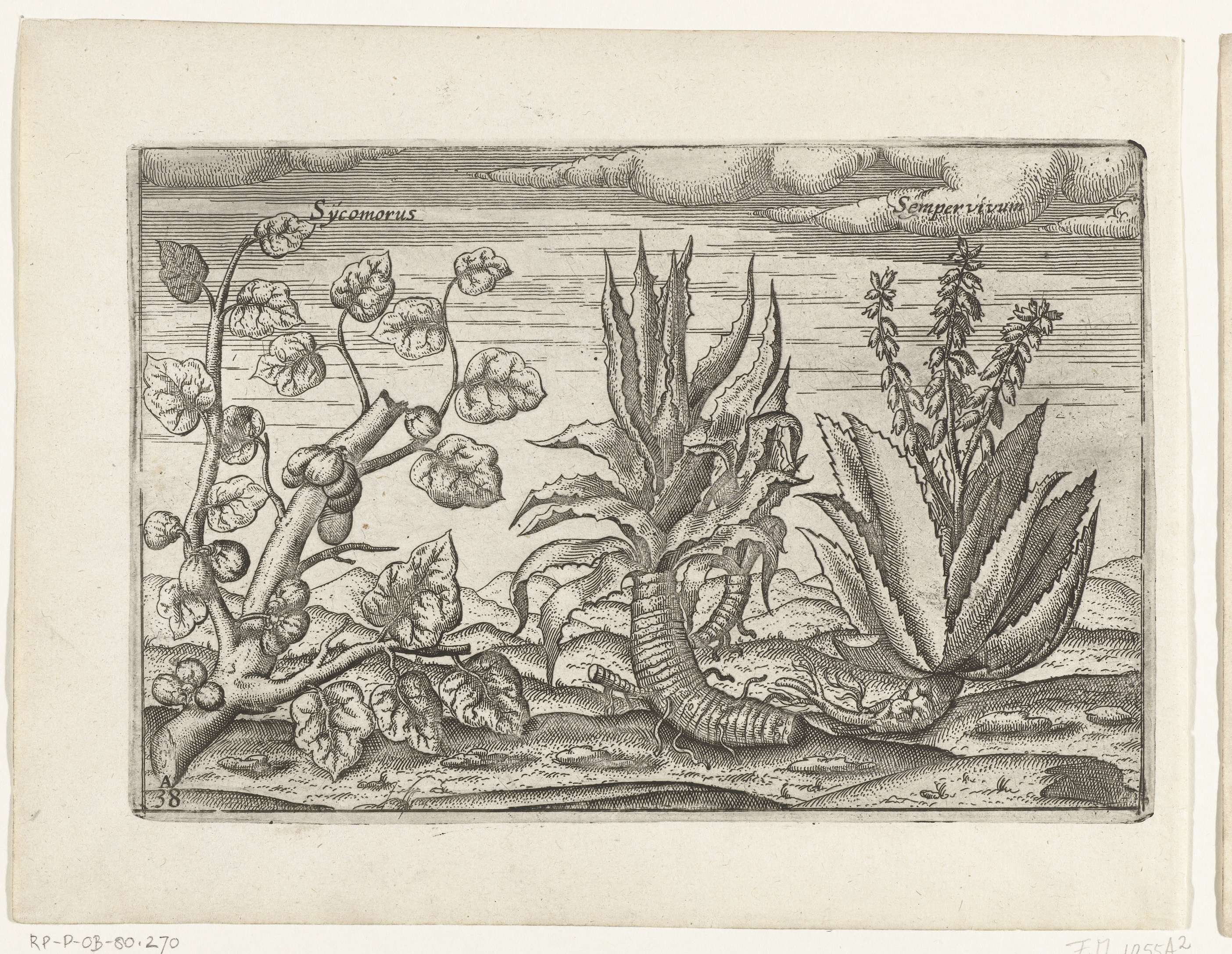 Wilde vijgenboom van het eiland Maio (Kaapverdische eilanden) en aloë's, 1596-1597. Afdrukken van de opgewerkte platen voor de oorspronkelijke illustraties in het reisverslag van de Eerste Schipvaert van Cornelis de Houtman naar Oost-Indië in 1595-1597. No. 38A.