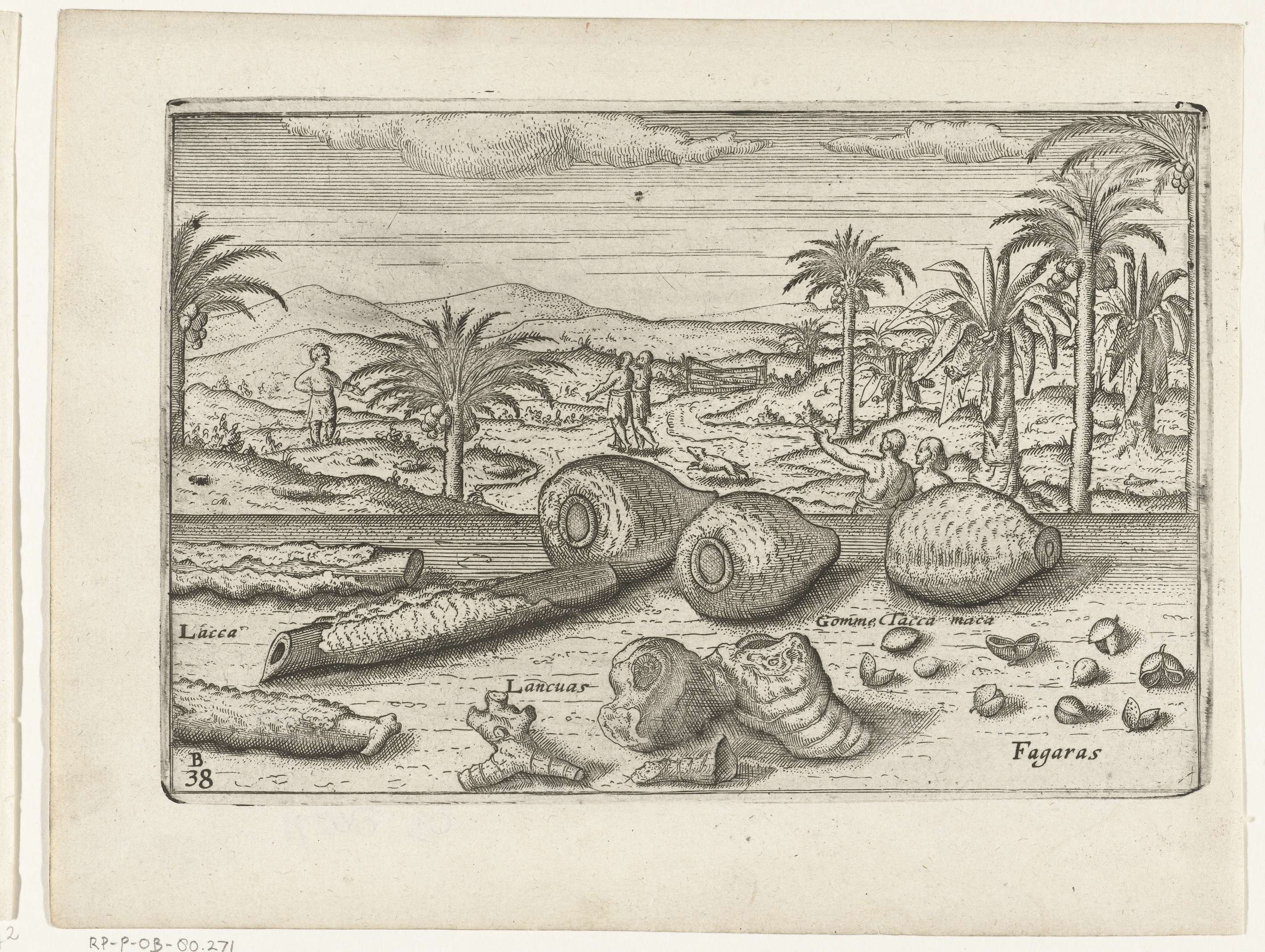 Kruiden en knolgewassen op Java, 1596. Galanga (lancuas) en kurkuma. Afdrukken van de opgewerkte platen voor de oorspronkelijke illustraties in het reisverslag van de Eerste Schipvaert van Cornelis de Houtman naar Oost-Indië in 1595-1597. No. 38B.
