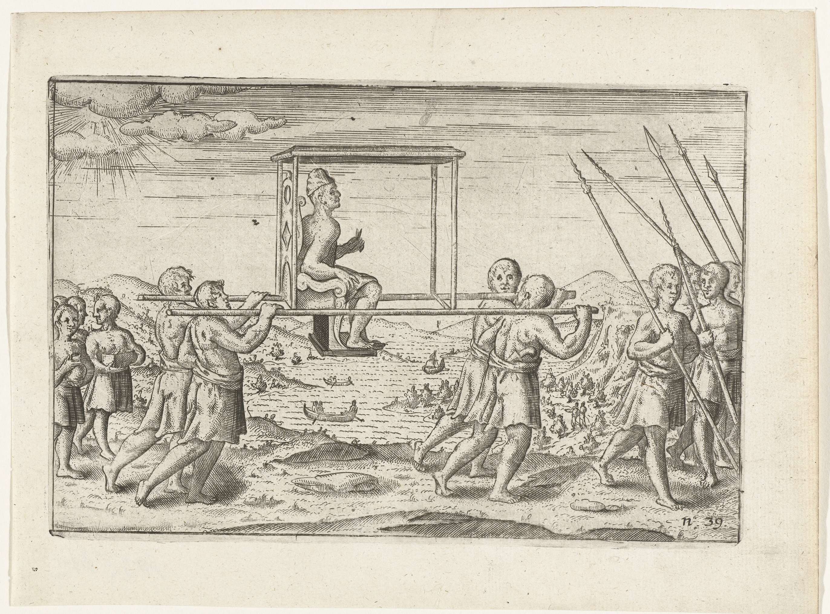 Een edelman op Bali laat zich in een draagstoel vervoeren, februari 1597. Afdrukken van de opgewerkte platen voor de oorspronkelijke illustraties in het reisverslag van de Eerste Schipvaert van Cornelis de Houtman naar Oost-Indië in 1595-1597. No. 39.