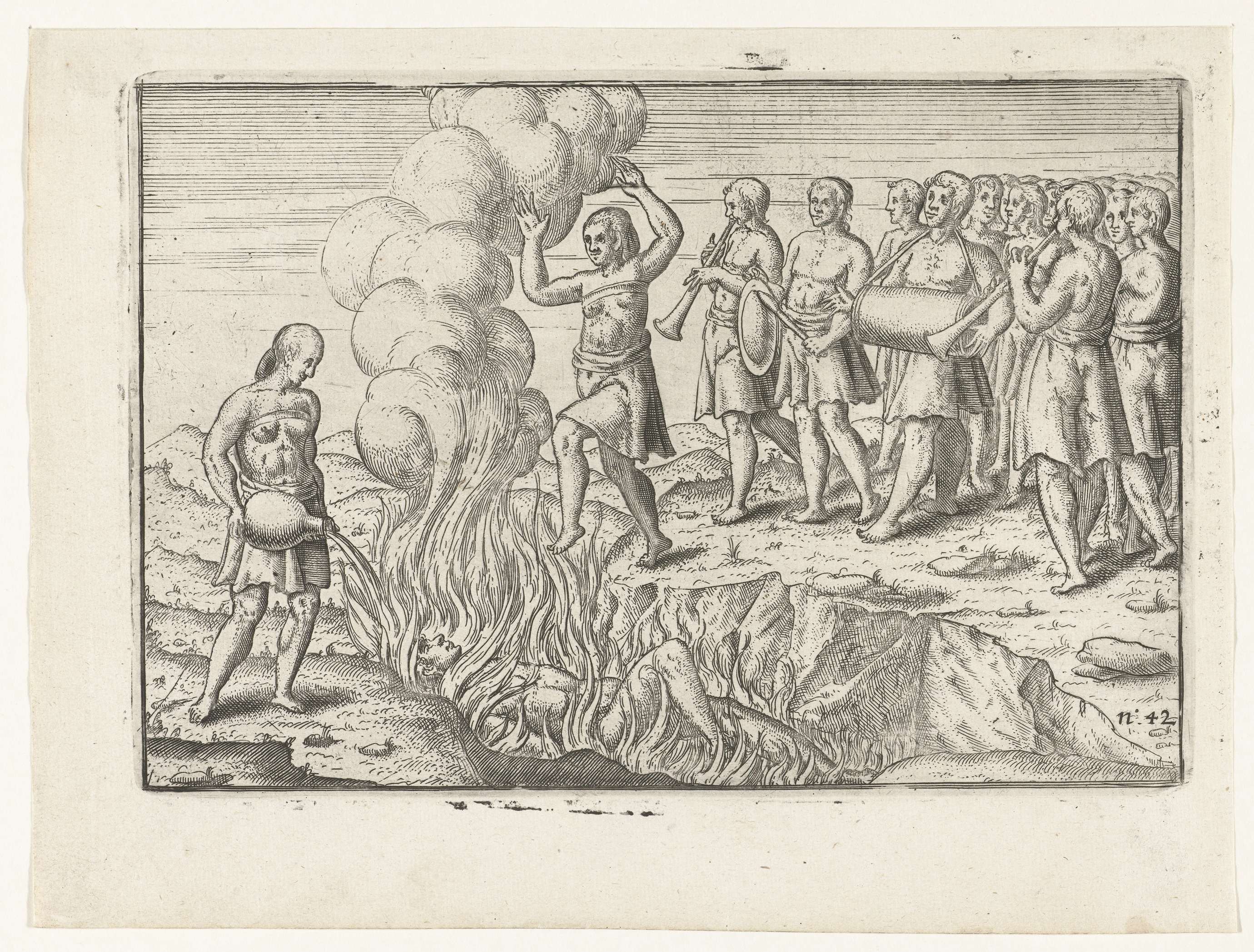 Volgens een oud gebruikt springt de vrouw op de brandstapel waarop het lichaam van haar overleden echtgenoot wordt verbrand, 1597. Rechts een groep muzikanten. Afdrukken van de opgewerkte platen voor de oorspronkelijke illustraties in het reisverslag van de Eerste Schipvaert van Cornelis de Houtman naar Oost-Indië in 1595-1597. No. 42.