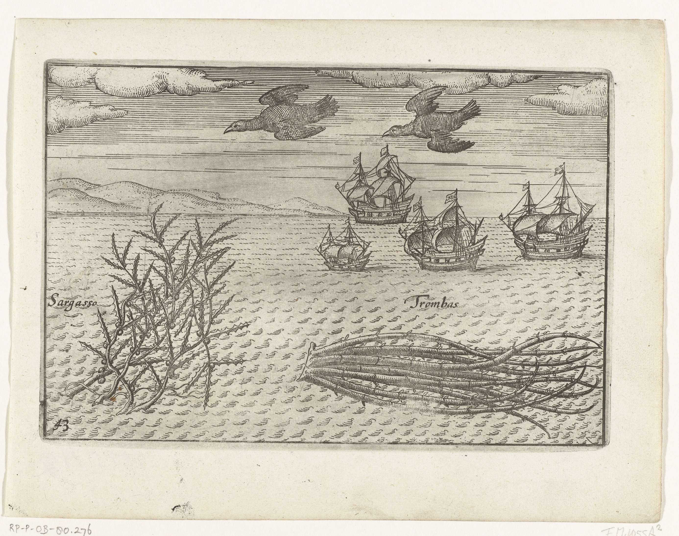 Sargassowier en trombas, twee soorten zeewier tegengekomen op de terugreis in 1597 in de buurt van kaap de Goede Hoop. De vier schepen zeilend voor de kust, in de lucht twee vogels. Afdrukken van de opgewerkte platen voor de oorspronkelijke illustraties in het reisverslag van de Eerste Schipvaert van Cornelis de Houtman naar Oost-Indië in ...