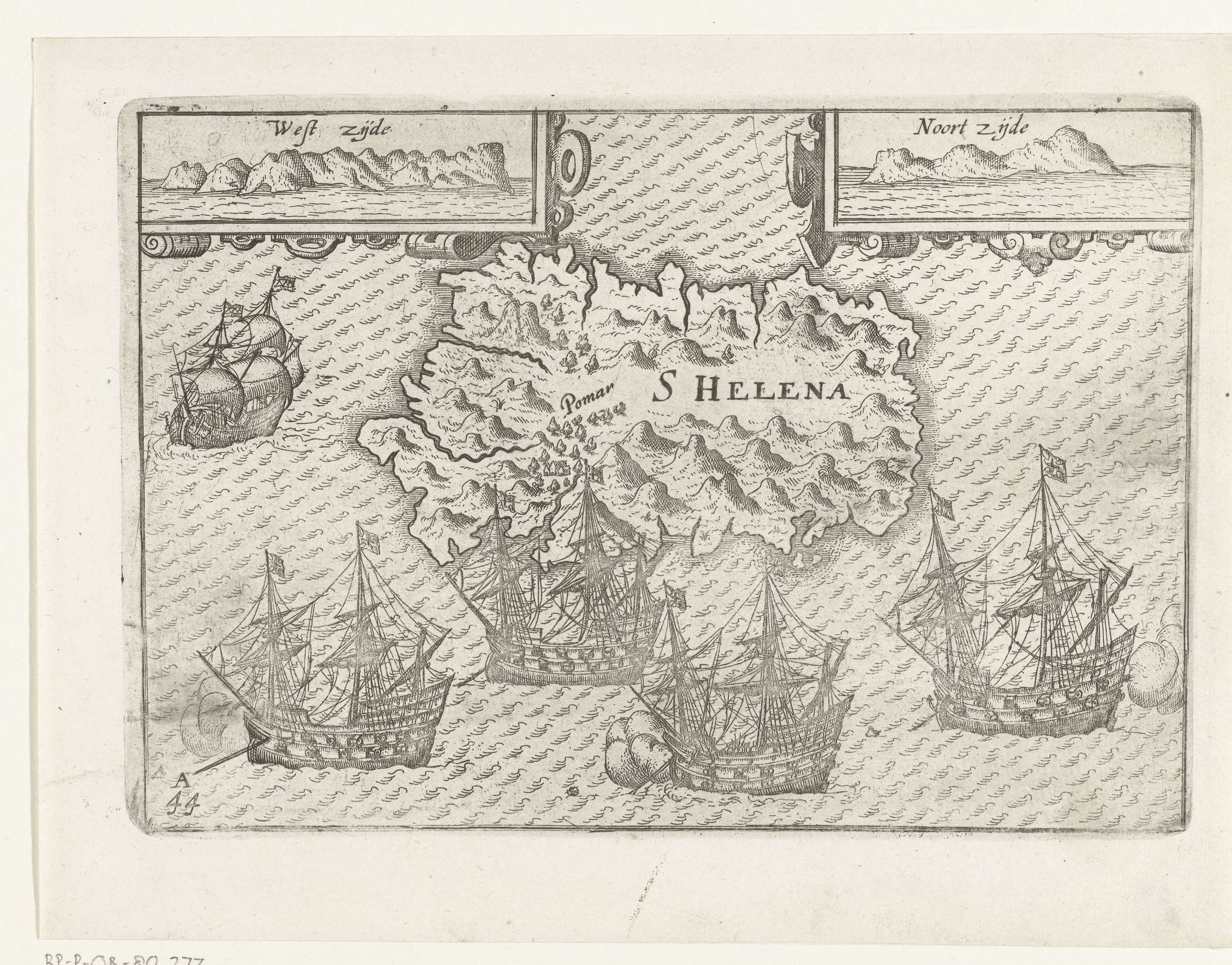 Kaart van Sint-Helena, aangedaan op de terugreis in 1597. Bij het eiland liggen vier Portugese schepen voor anker. Bovenaan in twee cartouches het profiel aan de westzijde en aan de noordzijde. Afdrukken van de opgewerkte platen voor de oorspronkelijke illustraties in het reisverslag van de Eerste Schipvaert van Cornelis de Houtman naar Oost-Indië in 1595-1597. ...