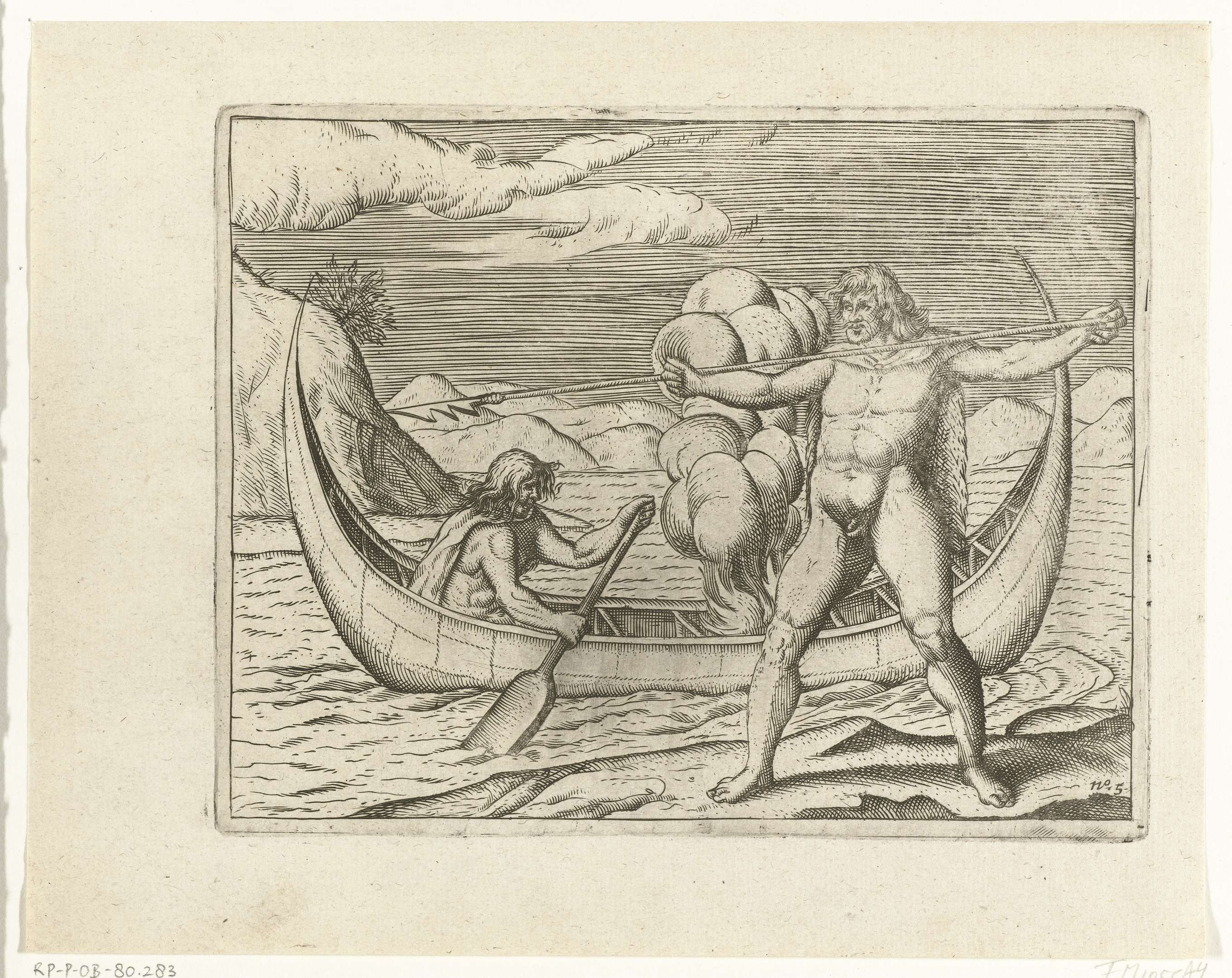Mannen van Tierra del Fuego of Patagonië, april-mei 1599. Twee mannen, één staand met een speer en één zittend in een kano. Kopieën naar de oorspronkelijke illustraties in het verslag van de Reis door de Straat Magellaan naar Oost-Indië door Sebald de Weert onder Mahu en De Cordes in 1598-1600. No. 5.