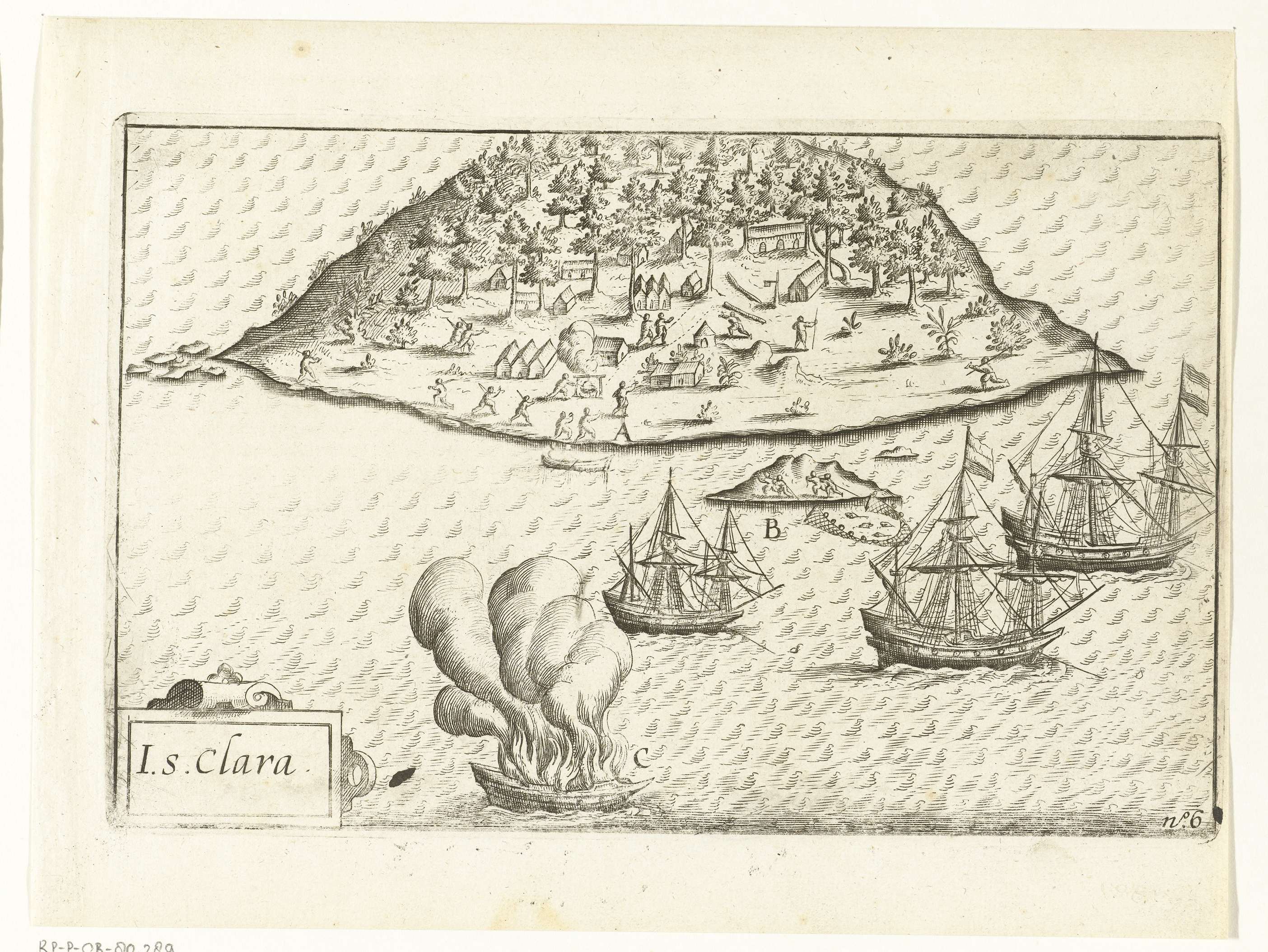 De schepen bij het eiland Santa Clara. Op het eiland worden verversingen ingeslagen en krijgen de zieken tijd om te herstellen. Het lekke schip De Eendracht wordt in brand gestoken, 3-21 juni 1599. De andere drie schepen liggen voor anker voor het eiland. Onderdeel van de illustraties in het verslag van de reis om de ...