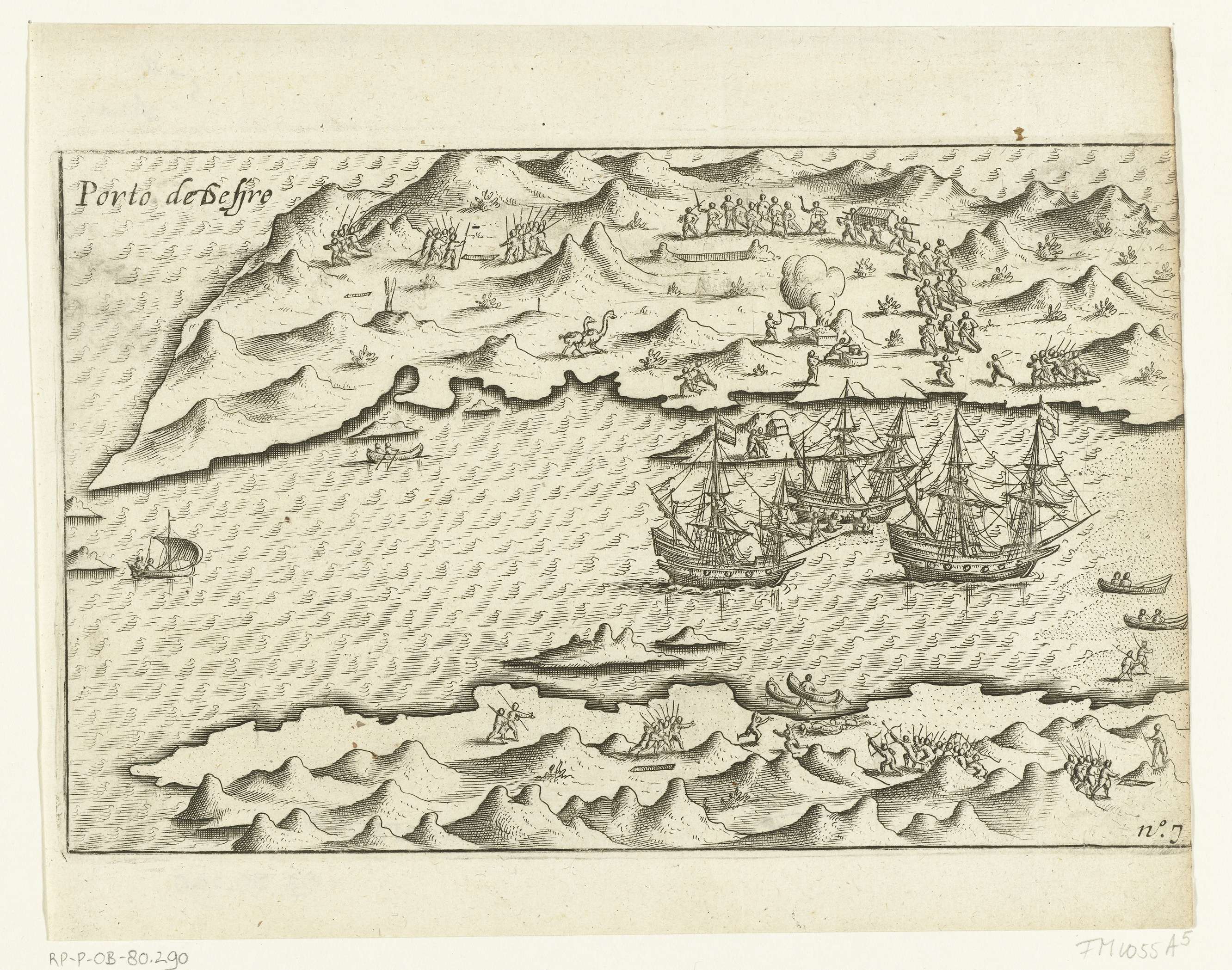 Aankomst van de drie schepen bij Porto Desire (Puerto Deseado), 20 september 1599. Op het land wordt gejaagd, gevochten met de oorspronkelijke bewoners van Zuid-Amerika en een overleden lid van de bemanning begraven. Onderdeel van de illustraties in het verslag van de reis om de wereld door Olivier van Noort in 1598-1601. No. 7.