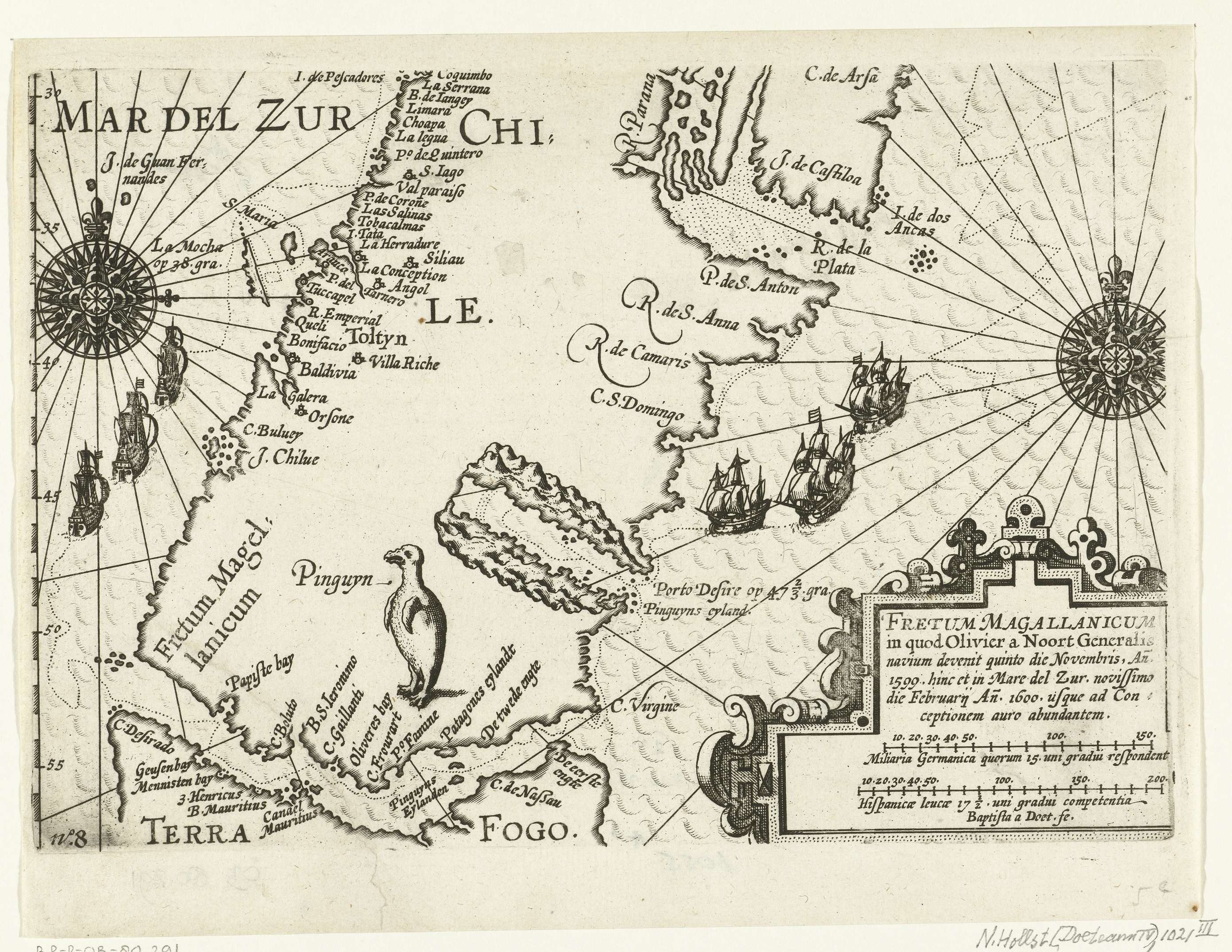 Kaart van de zuidpunt van Zuid-Amerika en de Straat Magellaan, waar de expeditie van Olivier van Noort aankomt in november 1599 en in februari 1600 weer uitvaart. Op de kaart is de route van de drie schepen uitgestippeld. Op het land een pinguïn. Rechtsonder een cartouche met titel en schalen. Onderdeel van de illustraties in ...