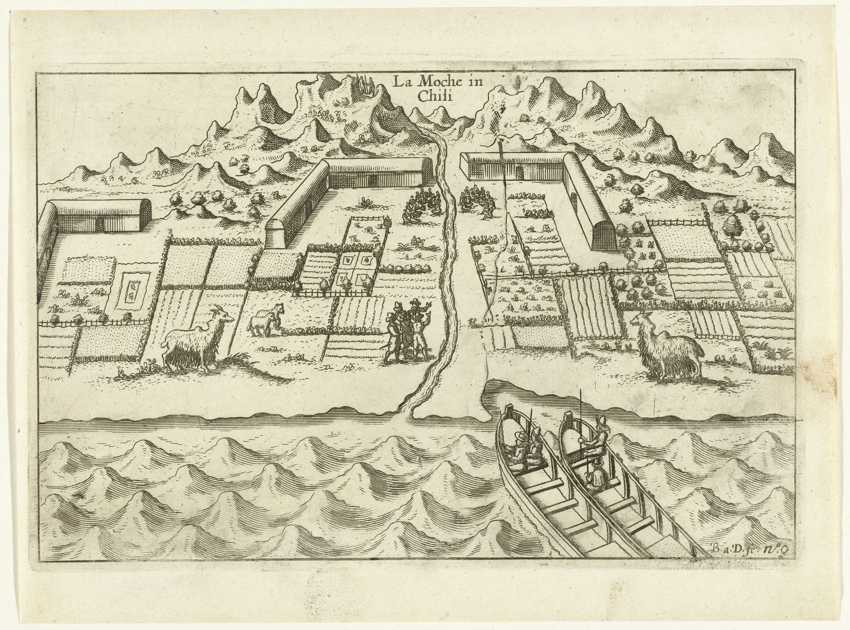 Aankomst van twee sloepen bij een dorp op het eiland Mocha in Chili, 22 maart 1600. Bij het dorp twee lama's. Onderdeel van de illustraties in het verslag van de reis om de wereld door Olivier van Noort in 1598-1601. No. 9.