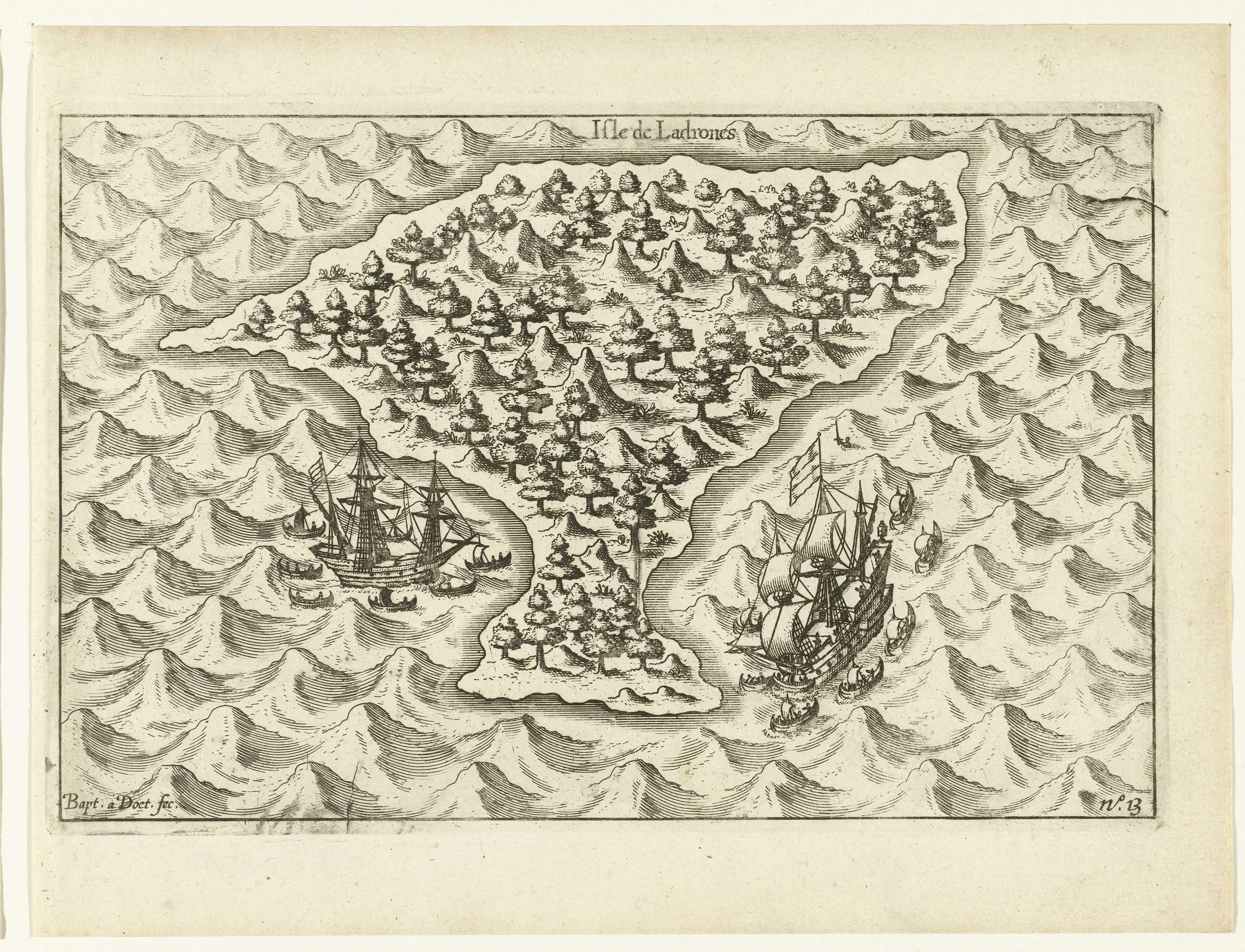 De twee schepen bij één van de Ladrones of Mariana eilanden, 15 september 1600. Onderdeel van de illustraties in het verslag van de reis om de wereld door Olivier van Noort in 1598-1601. No. 13.