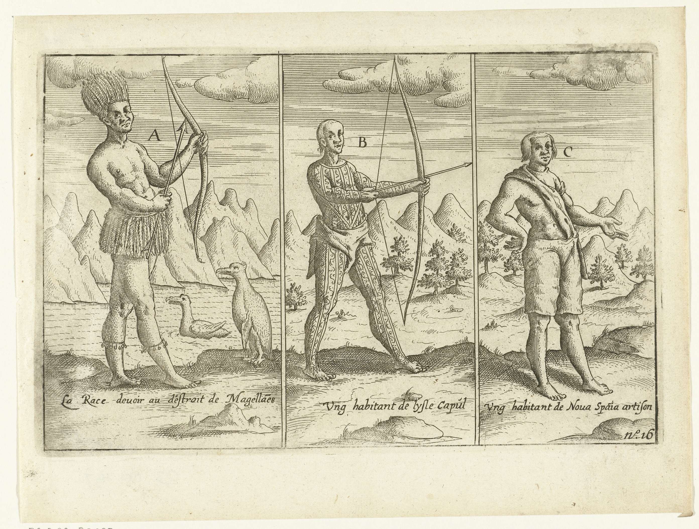 Drie verschillende voorbeelden van de lokale bevolking van de Straat Magellaan (A), het eiland Capul in de Filipijnen (B) en Nieuw Spanje (Midden-Amerika) (C), onderweg ontmoet in 1599-1600. Onderdeel van de illustraties in het verslag van de reis om de wereld door Olivier van Noort in 1598-1601. No. 16.