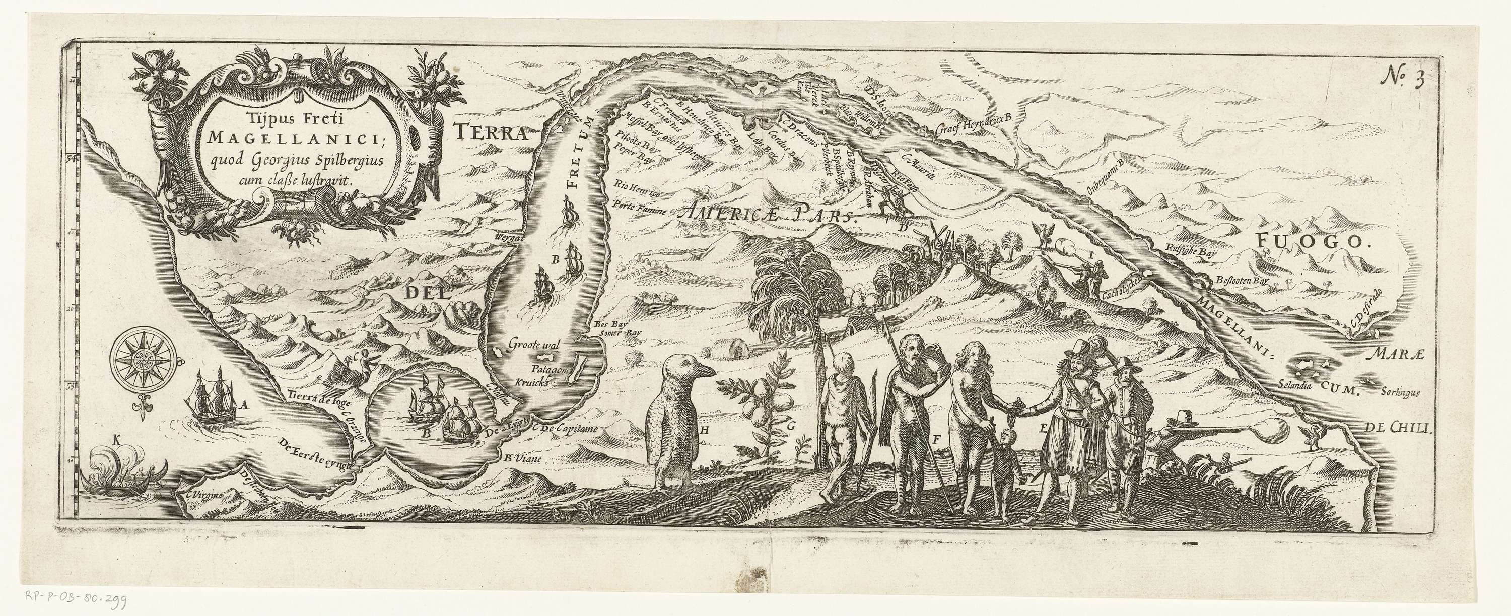 Kaart van de Straat Magellaan, april 1615. Vijf van de zes schepen varen door de Straat naar Chili. Het zesde schip overmeesterd door muitende bemanning en weggevaren. Op de voorgrond Joris van Spilbergen met leden van de lokale bevolking, links lokale gewassen en een pinguïn. Linksboven een cartouche met de titel in het Latijn. Onderdeel ...