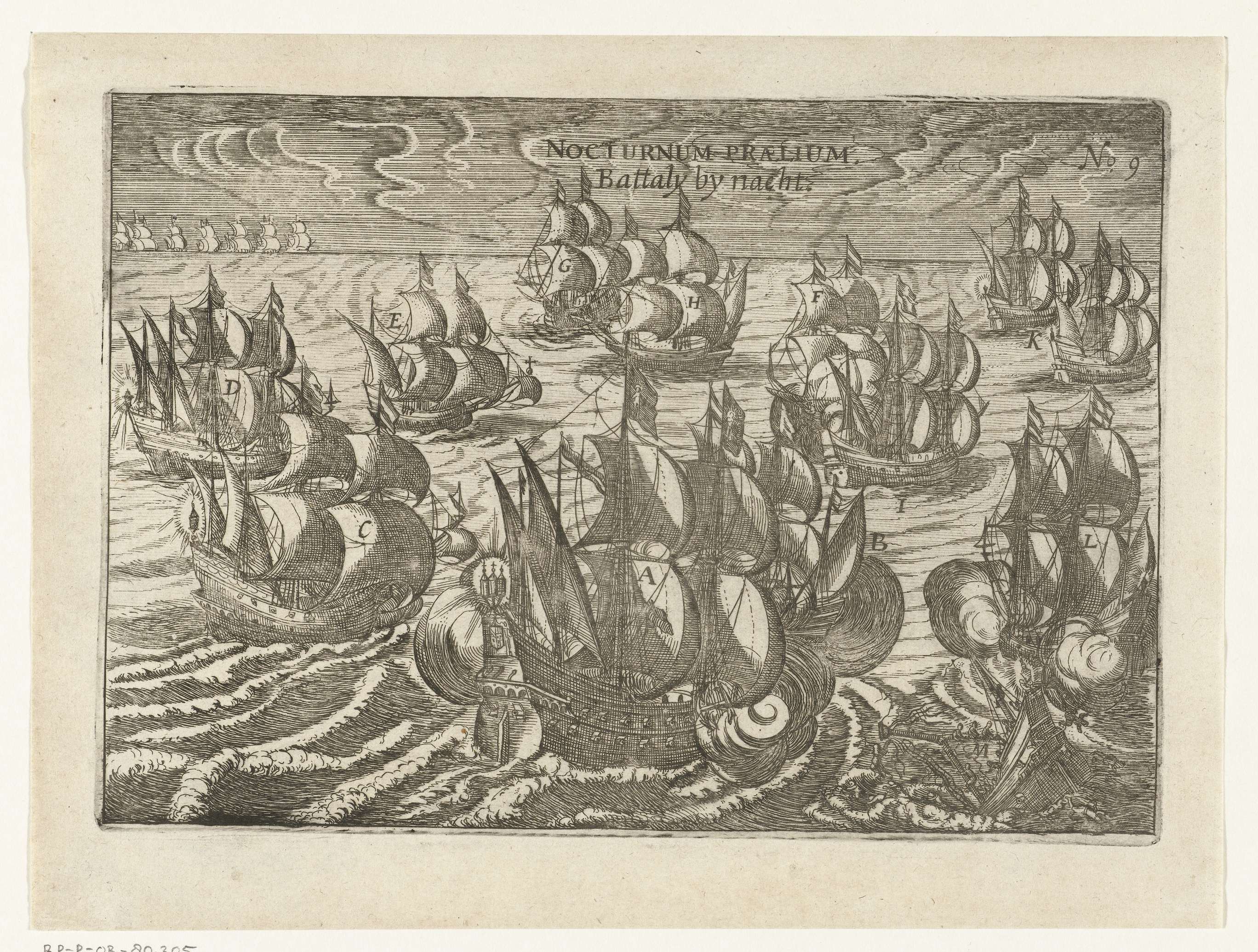 Gevecht met Spaanse schepen voor de kust bij Lima, in de nacht van 17 juni 1615. Onderdeel van de illustraties in het verslag van de reis van Joris van Spilbergen om de wereld, 1614-1617, No. 9.