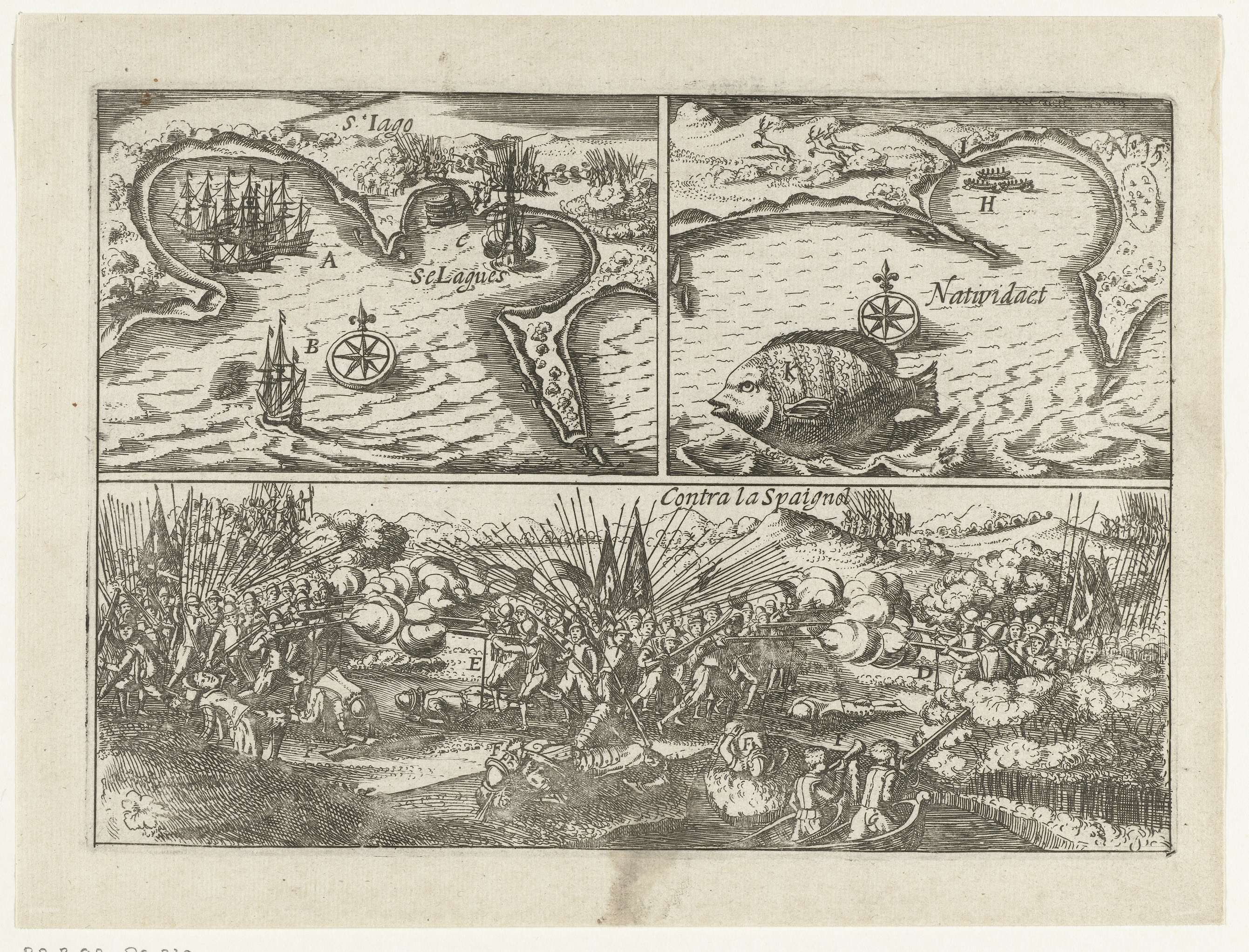 Drie voorstellingen met de vloot bij Santiago en Barra de Navidad in Mexico en het gevecht aldaar met de Spanjaarden op 11 november 1615. Onderdeel van de illustraties in het verslag van de reis van Joris van Spilbergen om de wereld, 1614-1617, No. 15.
