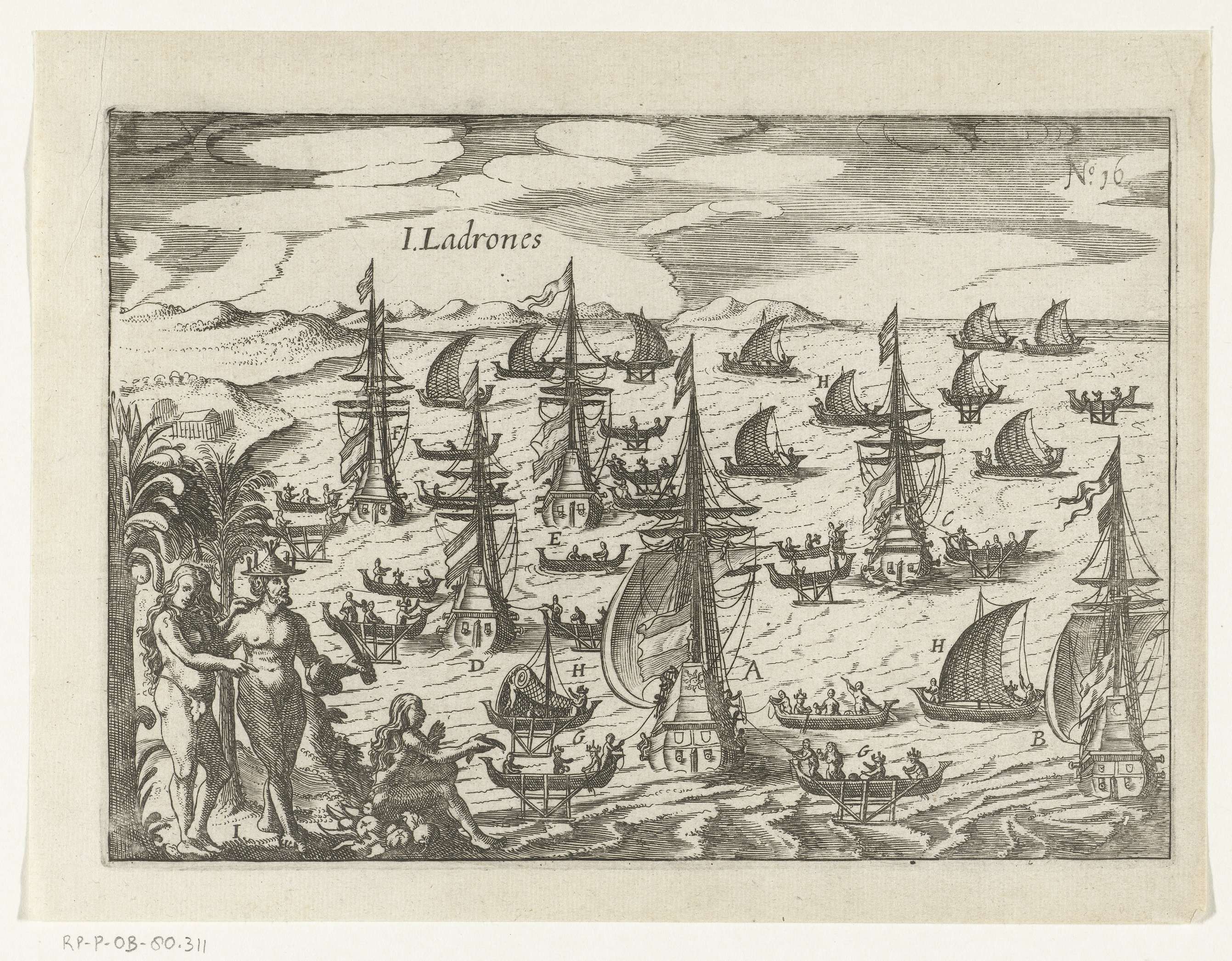 Aankomst van de vloot bij de Ladrones of Mariana eilanden, januari 1616. Voor anker liggen de schepen: de Son, de Maen, de Morghen-Ster, de Aeolus, de Jager en het veroverde schip. In het water verschillende typen van lokale vaartuigen. Links op de voorgrond twee voorbeelden van de lokale bevolking. Onderdeel van de illustraties in het ...