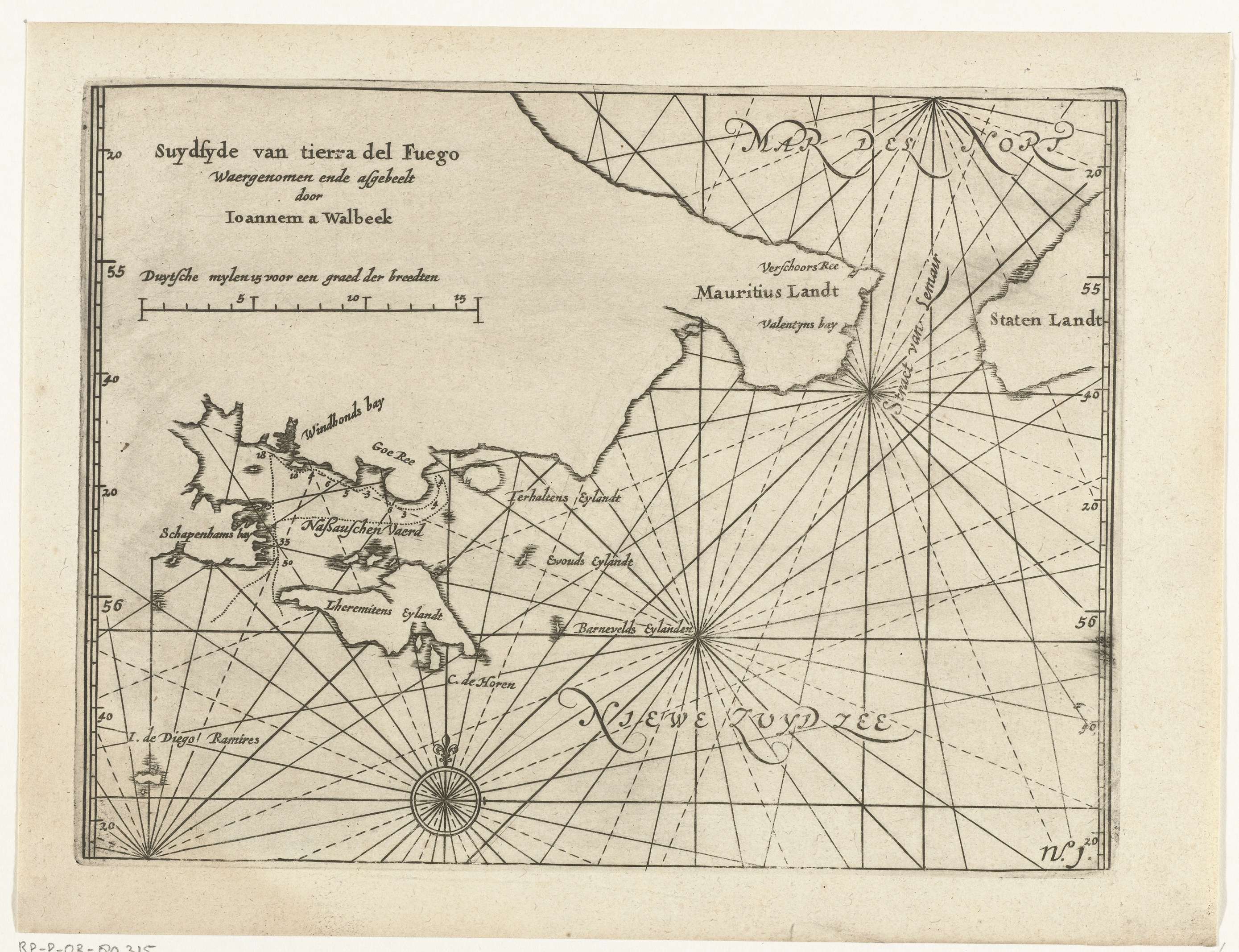 Kaart van het zuidpuntje van Tierra del Fuego met de Straat van Le Maire (Estrecho de Le Maire) tussen Mauritius Land en Staten Eiland (Isla de los Estados), 1624. Onderdeel van de illustraties in het verslag van de reis om de wereld van de Nassausche vloot onder Jacques l'Heremiet, 1623-1626, No. 1.