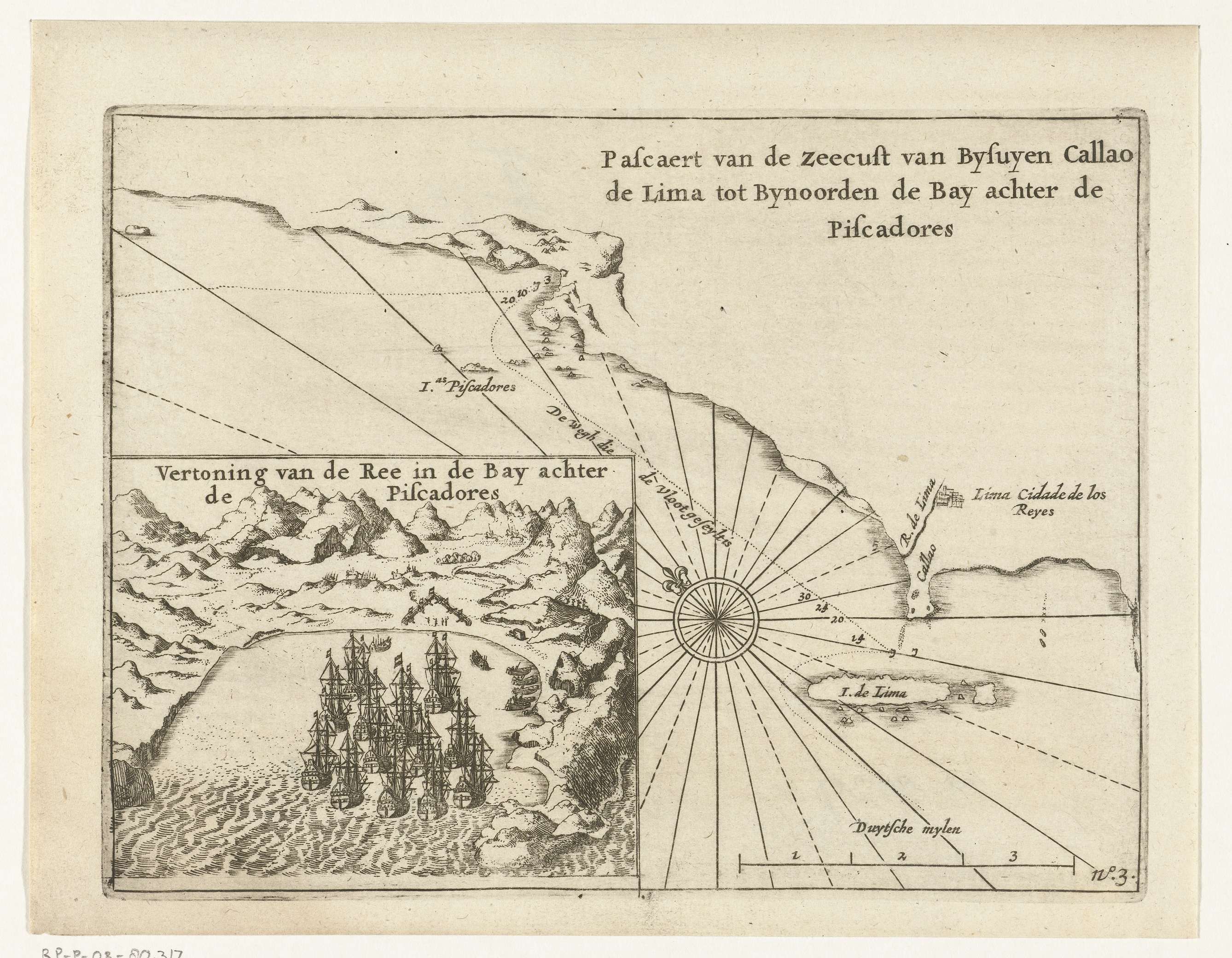 Kaart van de kust bij Callao bij Lima in Peru. Inzet met voorstelling van de vloot in de baai achter de Piscadores waar slag geleverd is met Spanjaarden op het strand, 15 augustus 1624. Onderdeel van de illustraties in het verslag van de reis om de wereld van de Nassausche vloot onder Jacques l'Heremiet, 1623-1626, ...