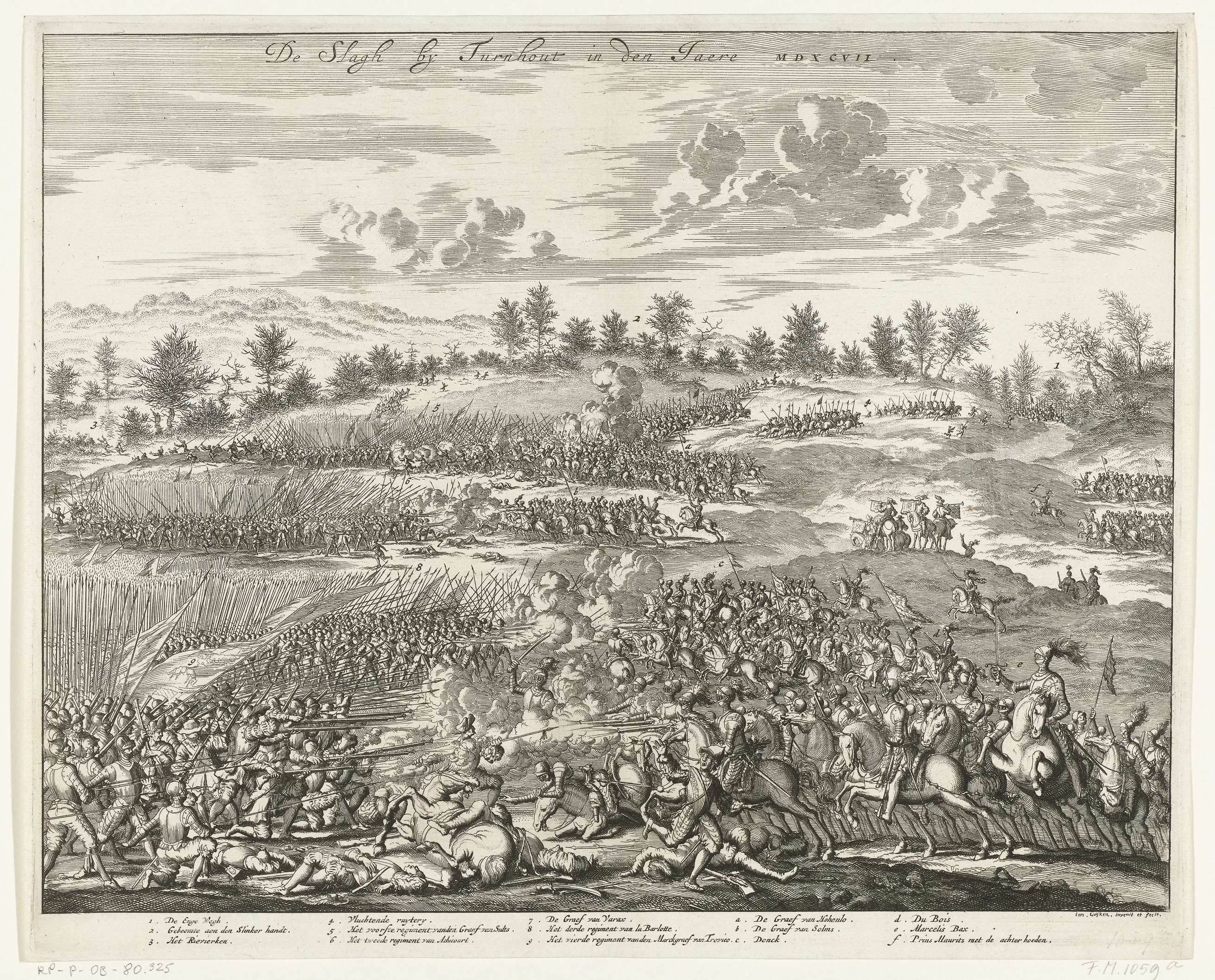 De slag bij Turnhout, 24 januari 1597. Op de voorgrond de slag tussen de Staatse cavalerie en de Spaanse infanterie, op de achtergrond de vluchtende Spaanse ruiters, rechts Maurits. In het onderschrift de legenda 1-9 en a-f.