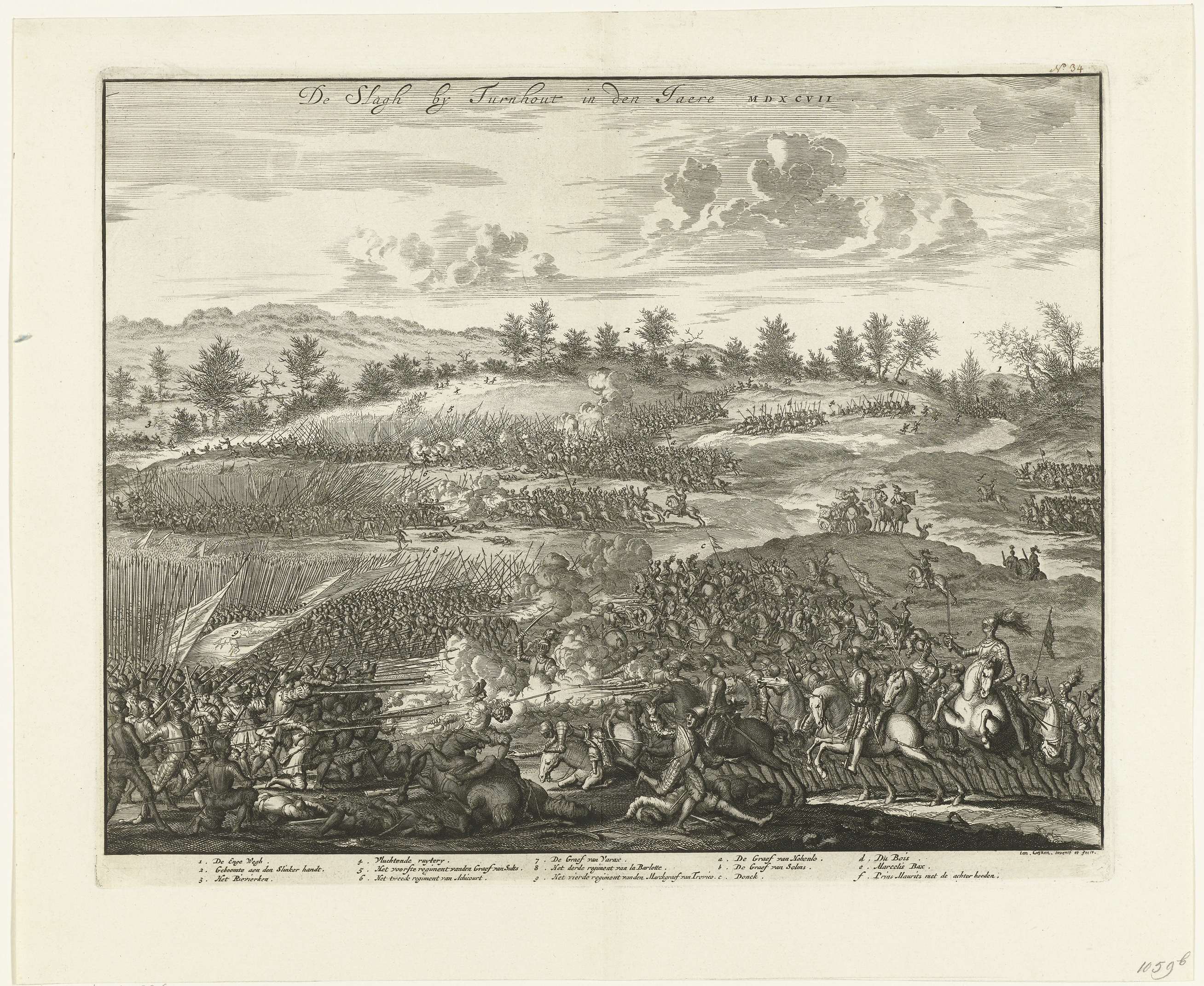 De slag bij Turnhout, 24 januari 1597. Op de voorgrond de slag tussen de Staatse cavalerie en de Spaanse infanterie, op de achtergrond de vluchtende Spaanse ruiters, rechts Maurits. In het onderschrift de legenda 1-9 en a-f.