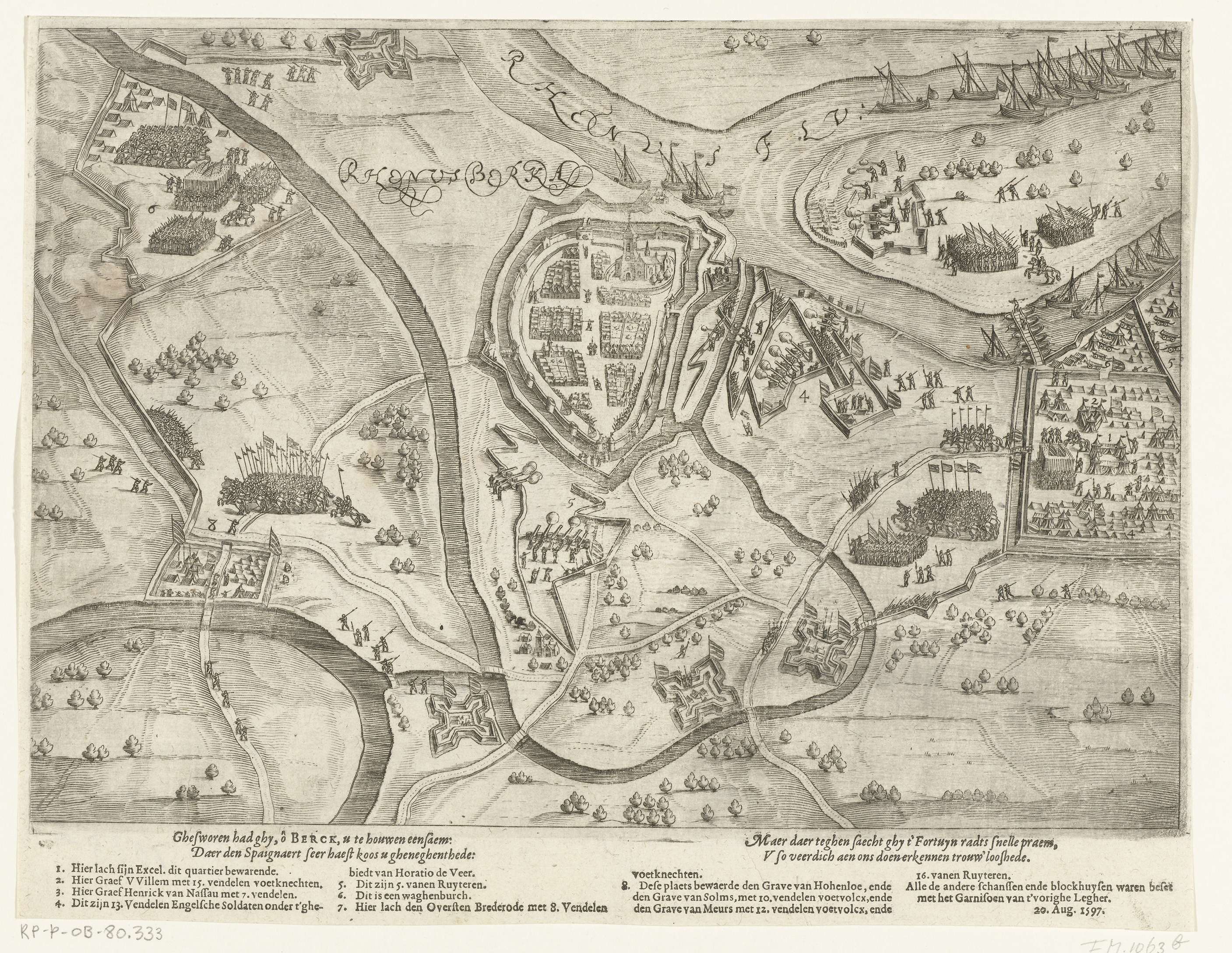 Beleg en verovering van Rheinberg (Rheinberg) door Staatse leger onder Maurits, 9-19 augustus 1597. Plan van de stad gelegen aan de Rijn en de nabije omgeving met forten en legerplaatsen. Apart gedrukt onder de plaat een vers van vier regels en de legenda 1-8 in het Nederlands met de datum 20 Aug. 1597.