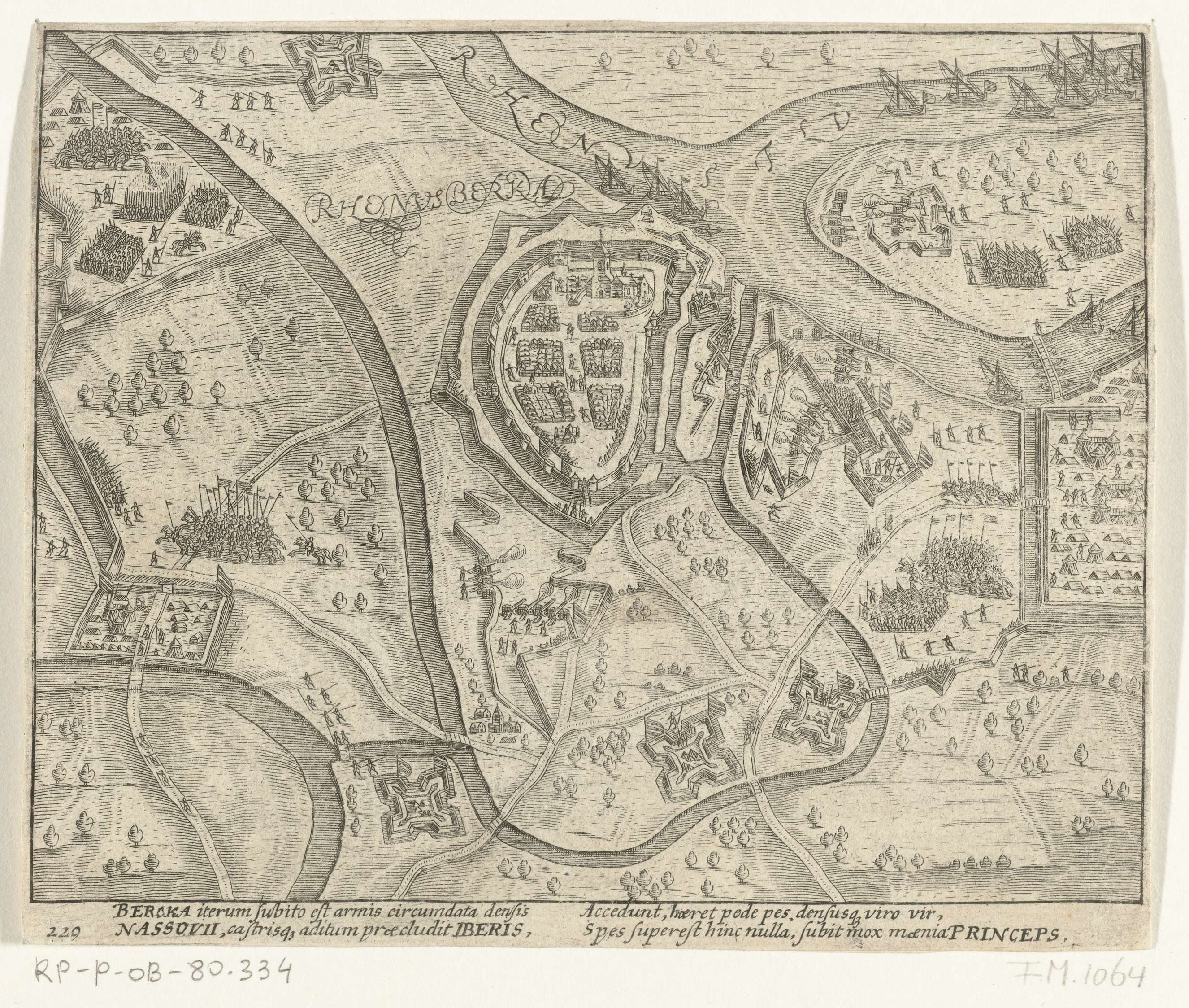 Beleg en verovering van Rheinberg (Rheinberg) door Staatse leger onder Maurits, 9-19 augustus 1597. Plan van de stad gelegen aan de Rijn en de nabije omgeving met forten en legerplaatsen. Met onderschrift van vier regels in het Latijn. Genummerd 229. Bedrukt op de achterzijde met tekst in het Latijn.