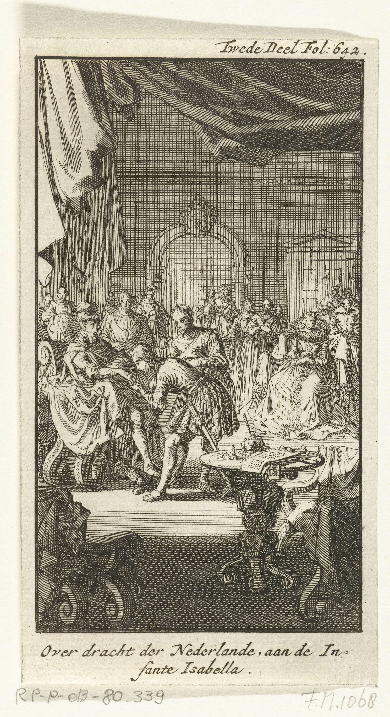 Overdracht van de Spaanse Nederlanden door Filips II aan Isabella Clara Eugenia, infante van Spanje, 10 september 1597. Interieur met Isabella Clara Eugenia, infante van Spanje en Filips II op zijn troon, een man buigt voor hem en kust zijn hand.