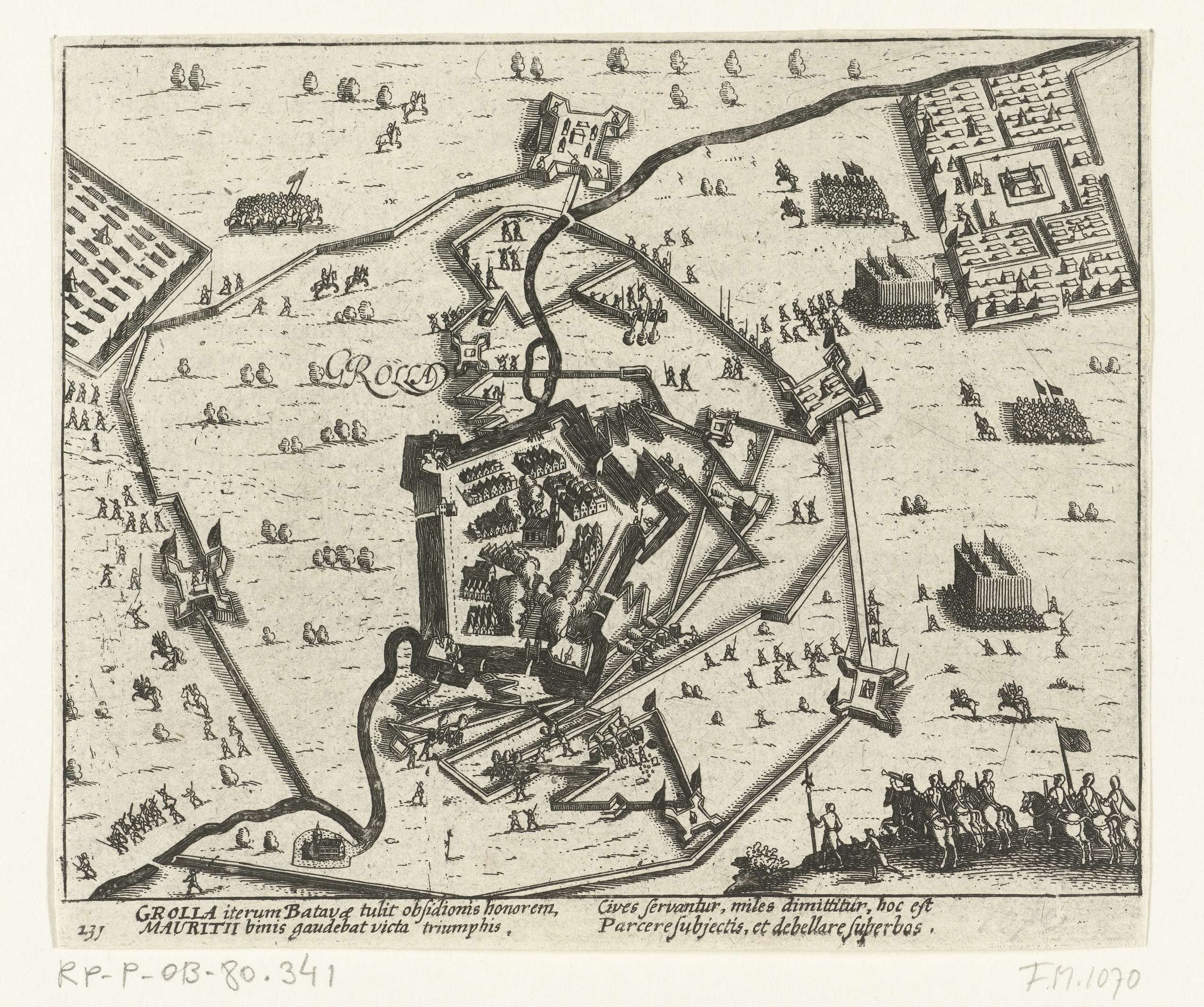 Beleg en verovering van Groenlo (Grol) door het Staatse leger onder prins Maurits, 28 september 1597. Plan van de stad met de posities van het belgerende Staatse leger. Met onderschrift van vier regels in het Latijn. Genummerd 231. Bedrukt op de achterzijde met tekst in het Latijn.