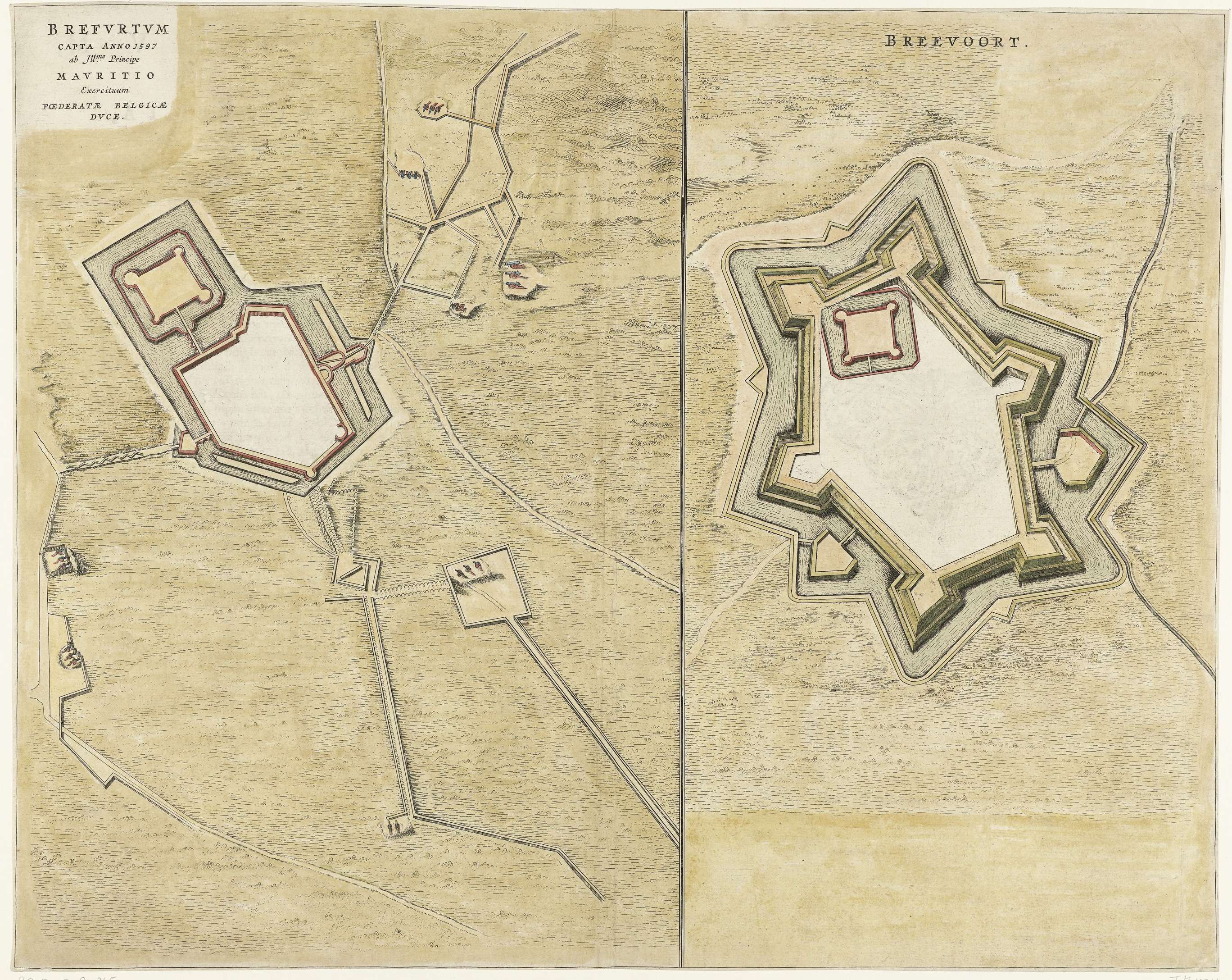 Ingekleurde plattegrond van de stad stad en het kasteel van Bredevoort met de versterkingen, ten tijde van de verovering door het Staatse leger onder prins Maurits, 12 oktober 1597. Dubbel gevouwen blad bedrukt op achterzijde met tekst in het Latijn.