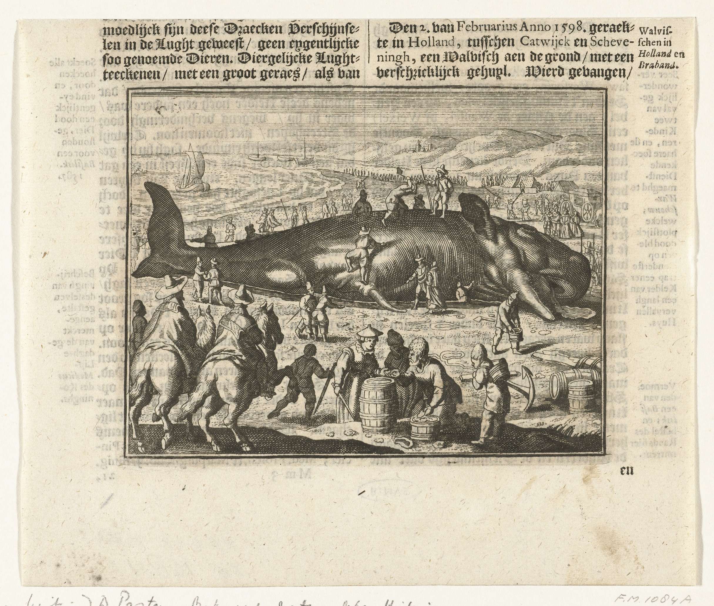 De walvis (potvis) gestrand op 2 februari 1598 op het strand bij Berckhey tussen Katwijk en Scheveningen. Op de voorgrond twee ruiters en figuren rond een ton. Uit een Nederlands boek met gedrukte tekst aan de boven- en achterzijde.