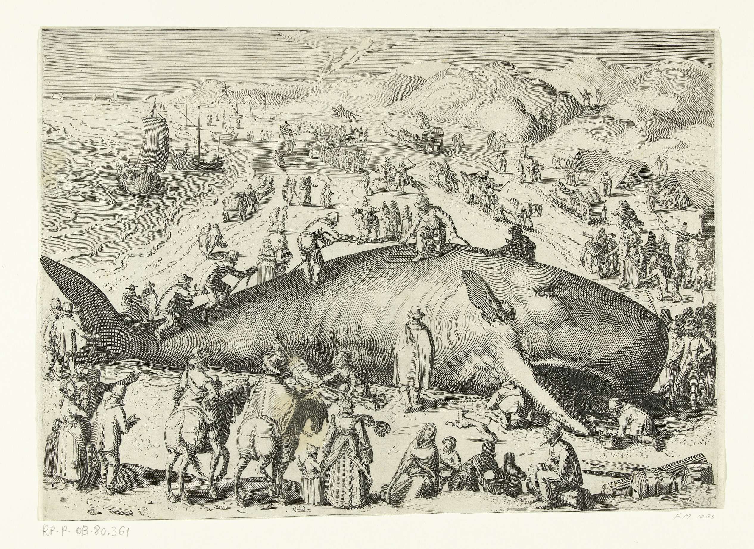 Vrije kopie naar de prent van de walvis (potvis) gestrand op 2 februari 1598 op het strand bij Berckhey tussen Katwijk en Scheveningen, hier voorgesteld als de walvis gestrand bij Noordwijk op 28 december 1614. Vijf mannen beklimmen het dier om het op te meten. Met veel bezoekers, op de voorgrond enkele ruiters, achter het ...